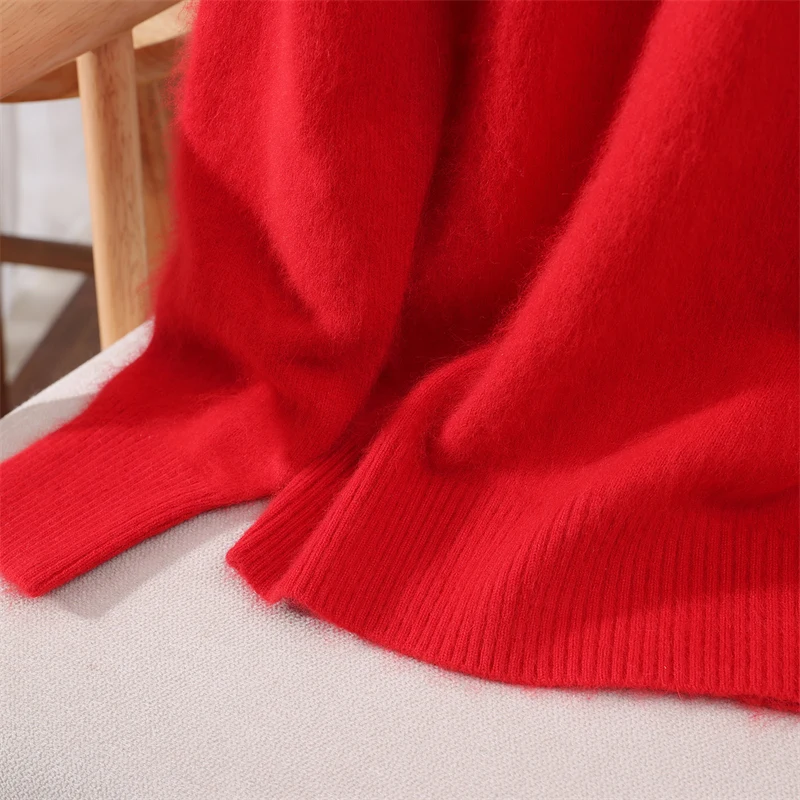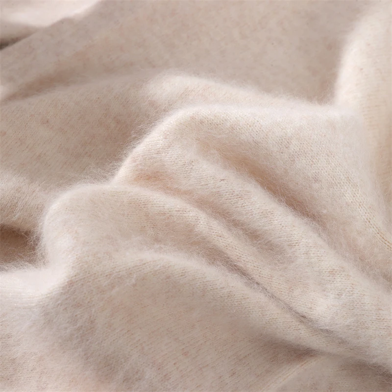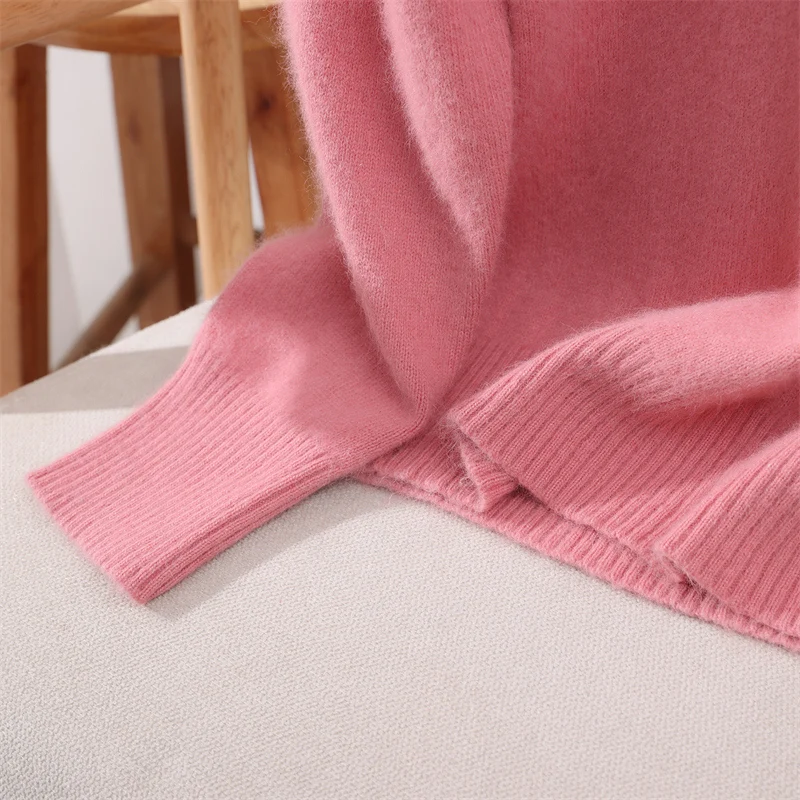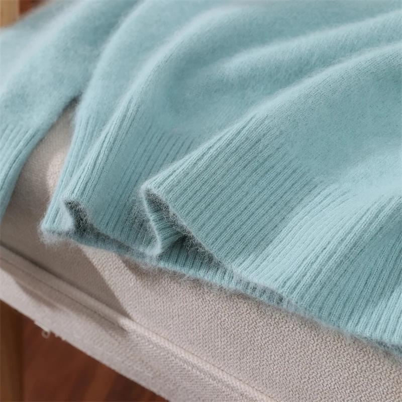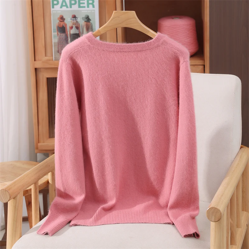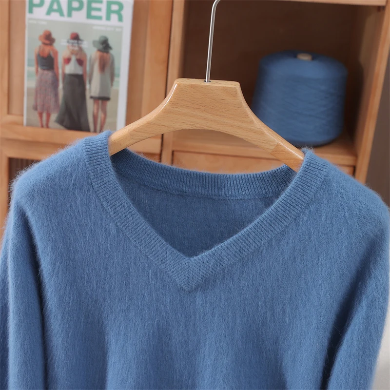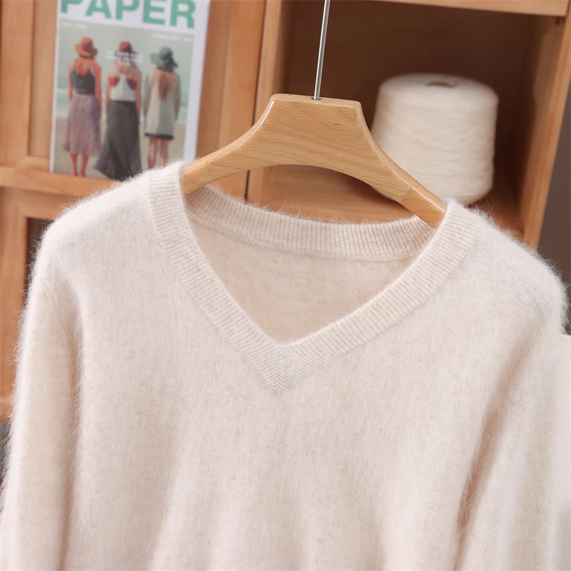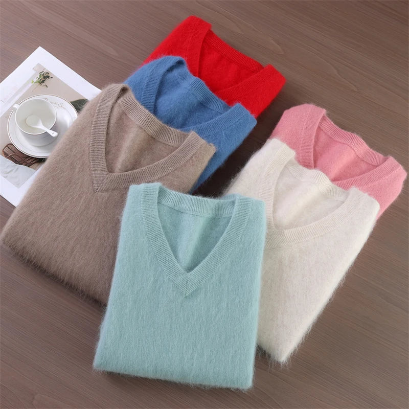 100% Mink Cashmere Pullover Sweater New Autumn Winter Women's V-neck Soild High-end Soft Warm Basic Knitted Long Sleeve Tops