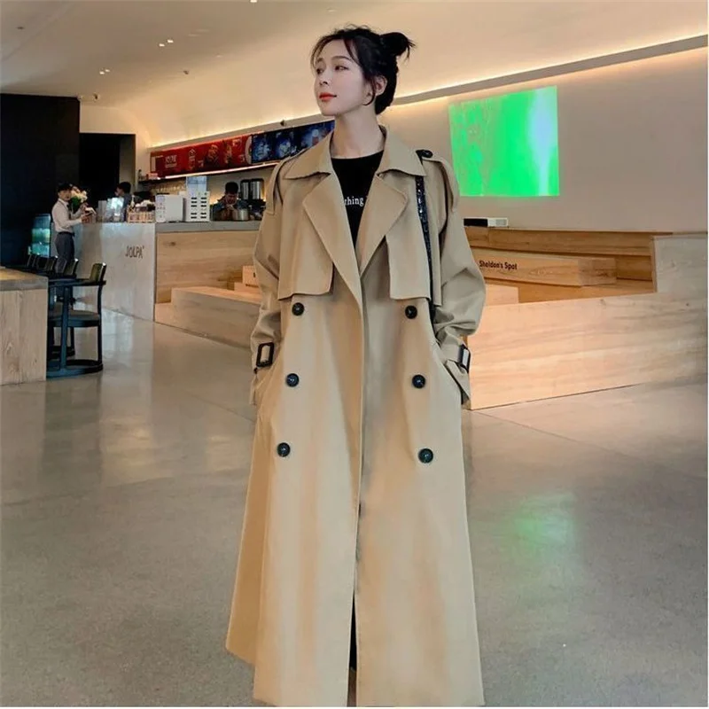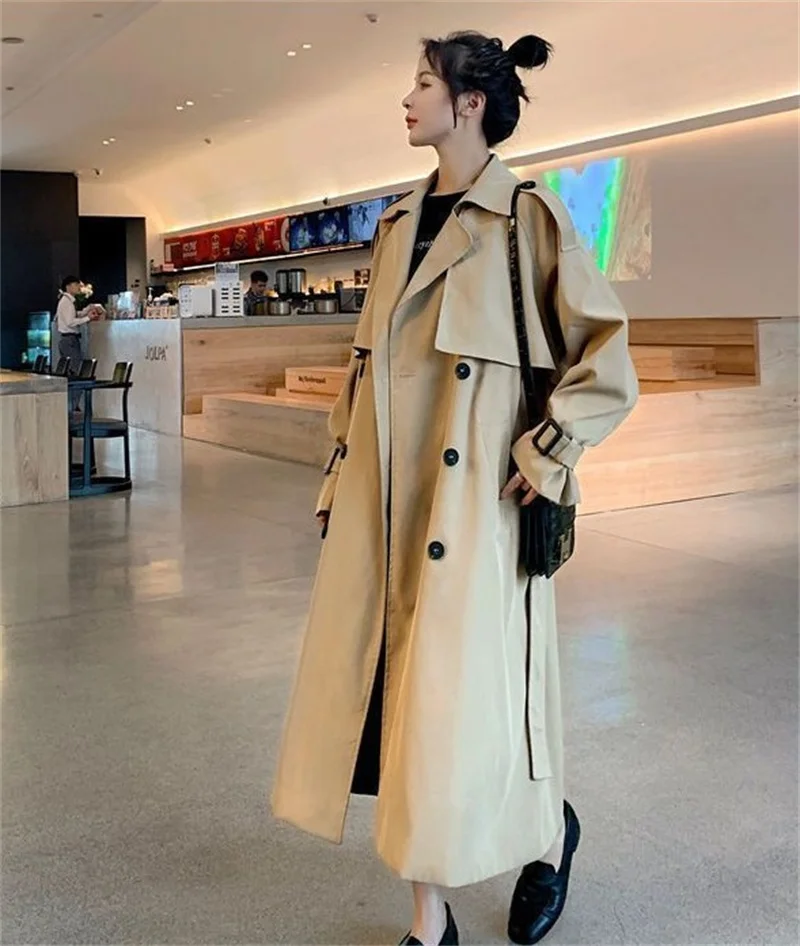 Autumn Winter Khaki Long Trench Coat for Women 2025 Jacket Elegant Outerwear Turn-down Collar Tie Belt Korean Chic Windbreaker