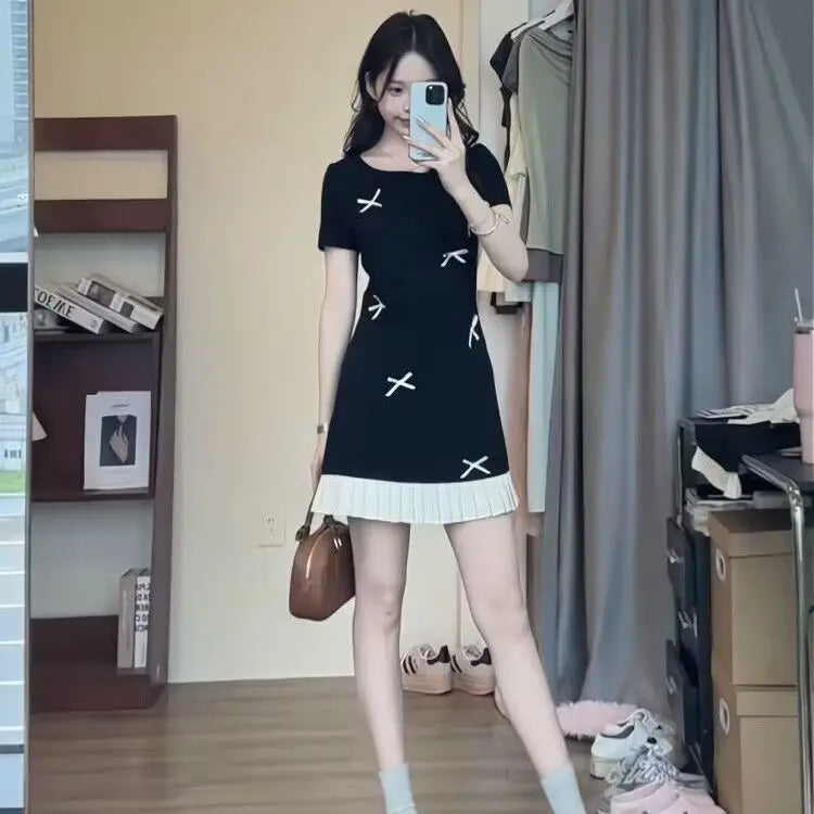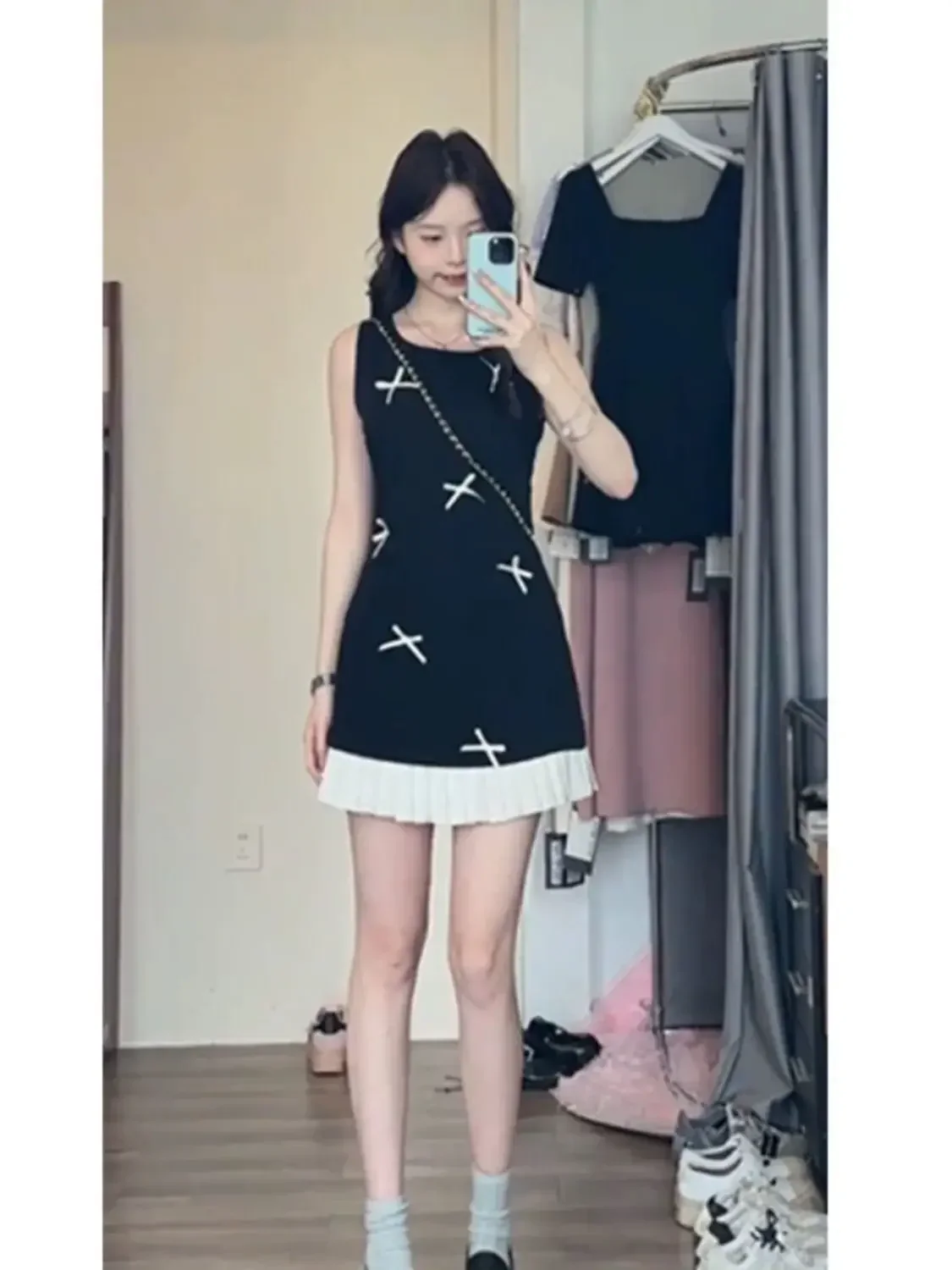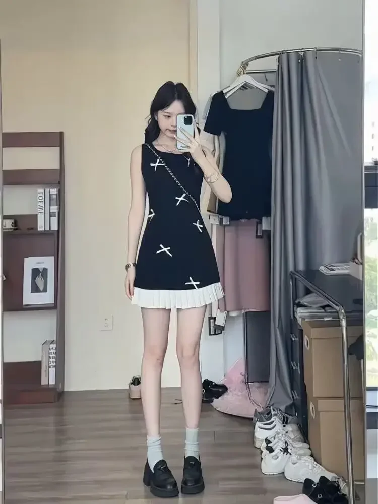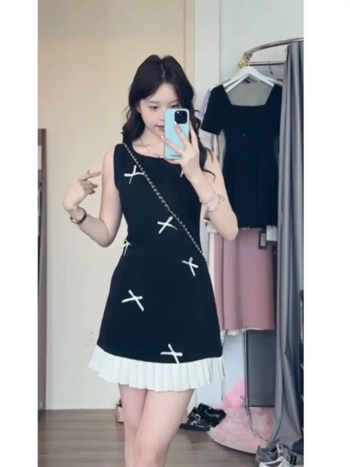 Bow summer dress design slim 2025 sleeveless splicing contrast color small person waist