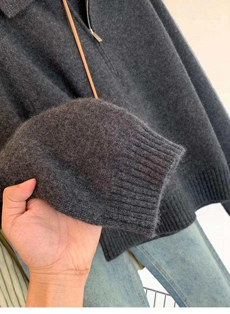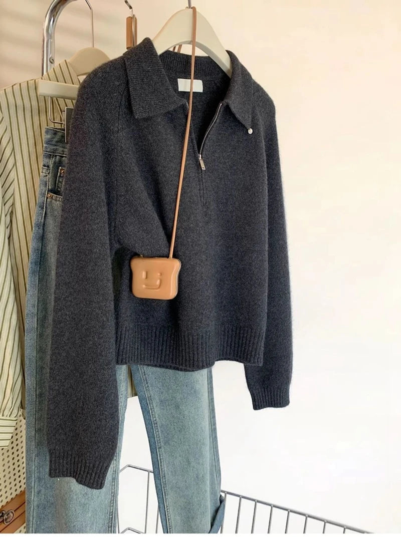 Dark Gray Polo Collar Half Zipper Sweater Women Autumn And Winter 2025 New Lapel Small Sweater Top