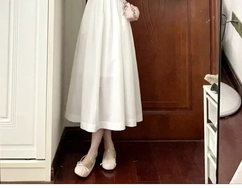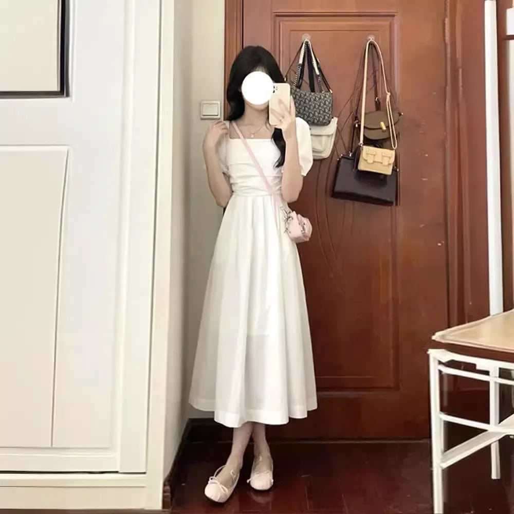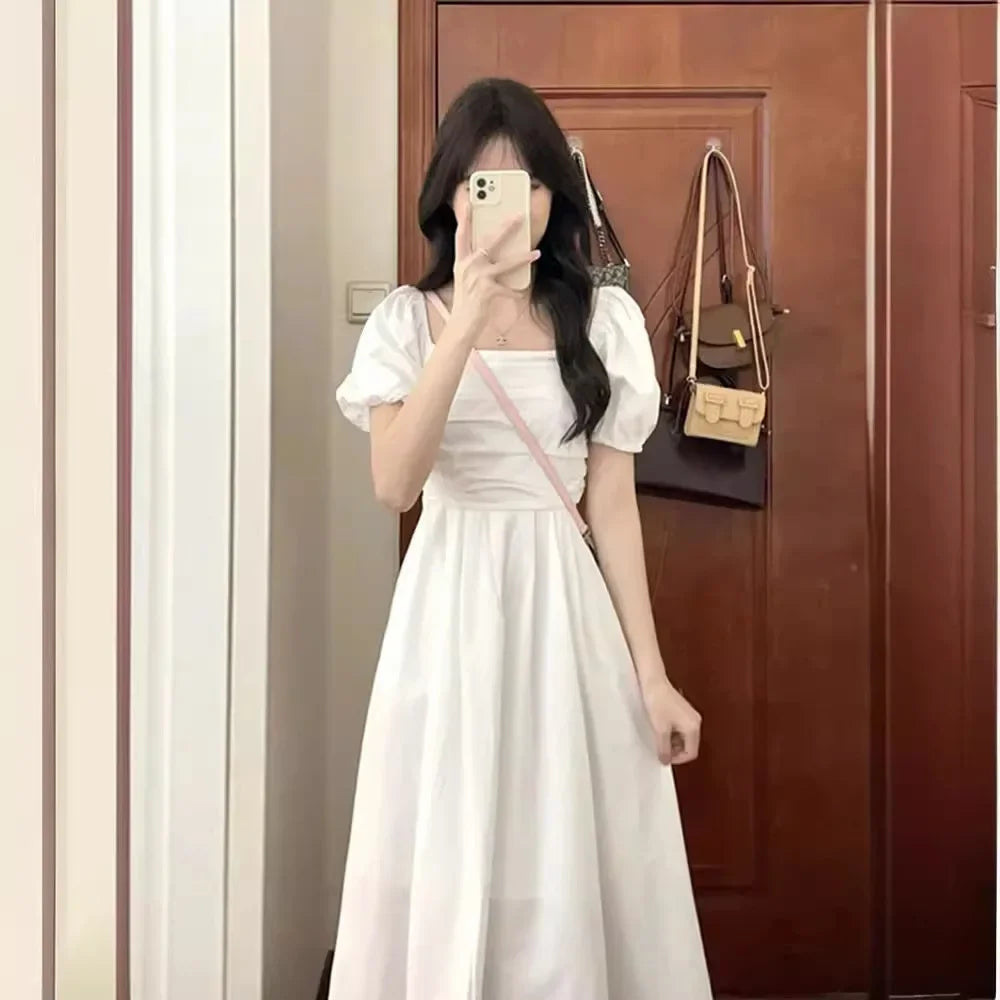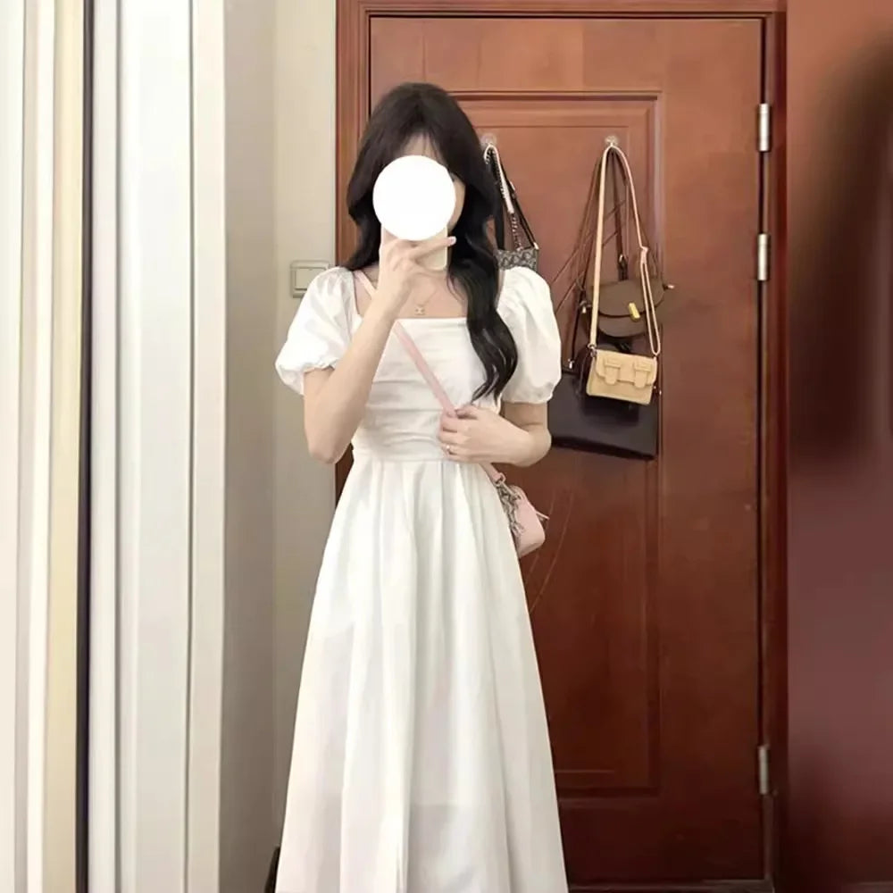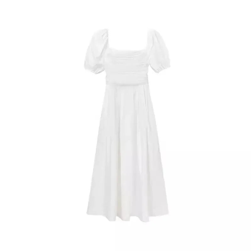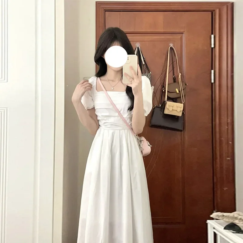 Elegant High-Waisted Long Dress Slimming Petite Puff Sleeve Summer New Style French Chic Square Collar White Dress For Women