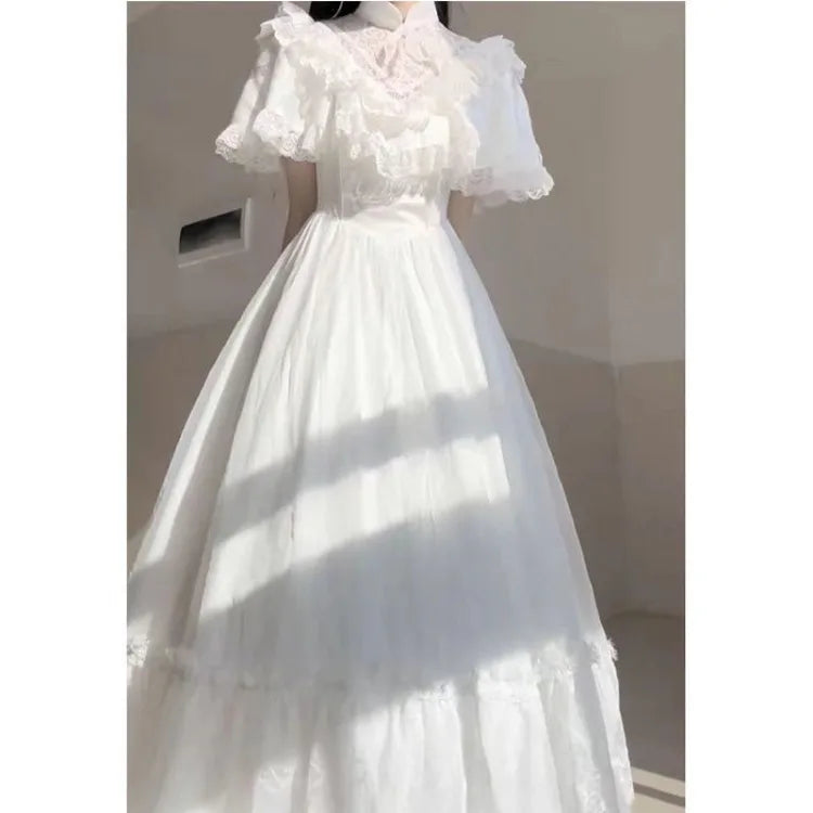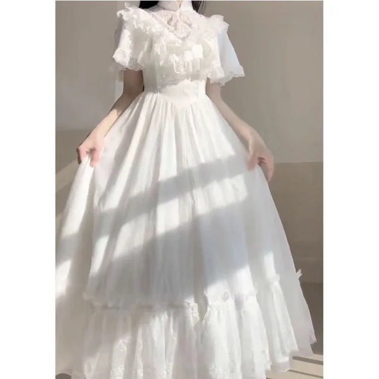 Elegant Vintage Lace White Lolita Dresses Summer Sweet Puff Sleeve Dress for Women 2025 New Slim Waist Mid-length Vestidos Mujer