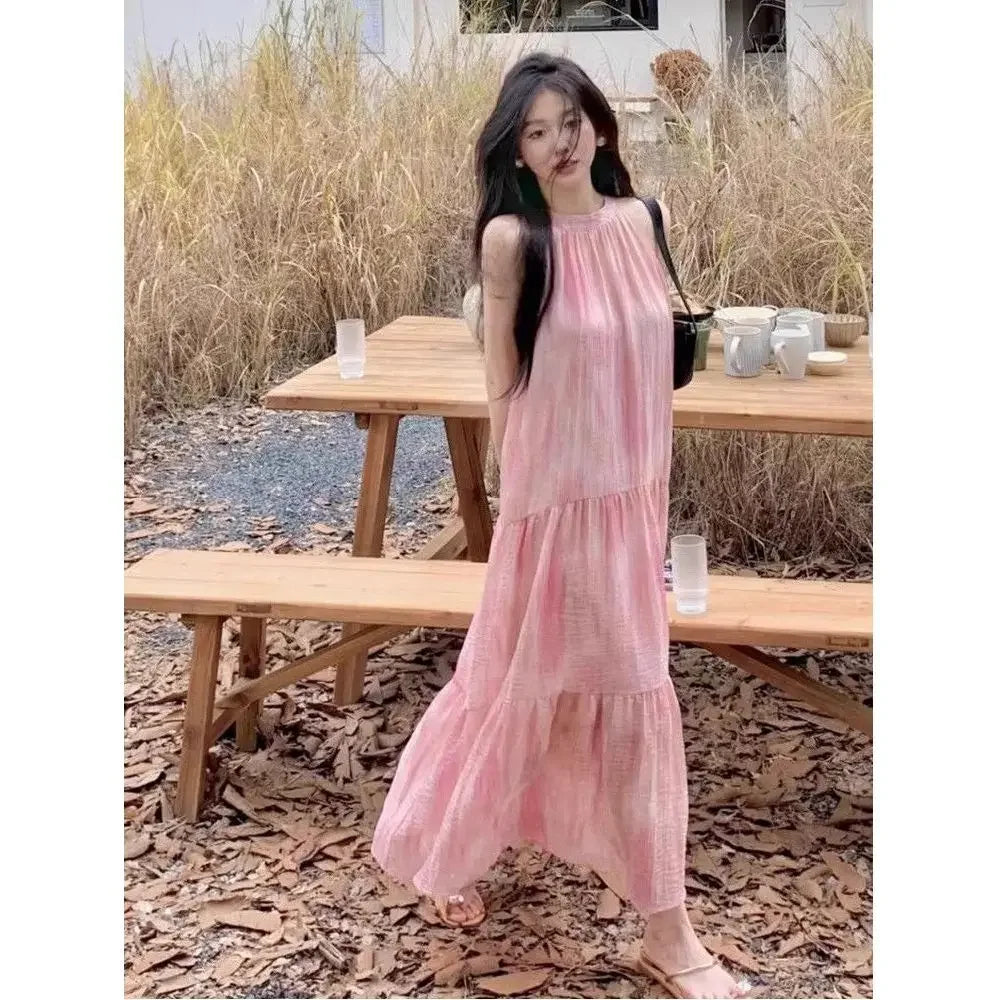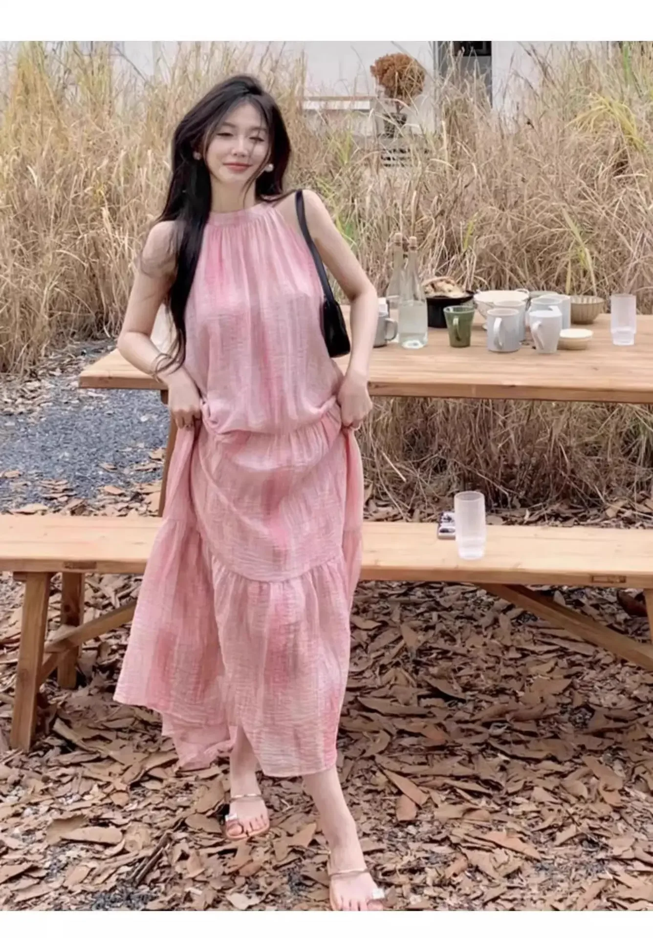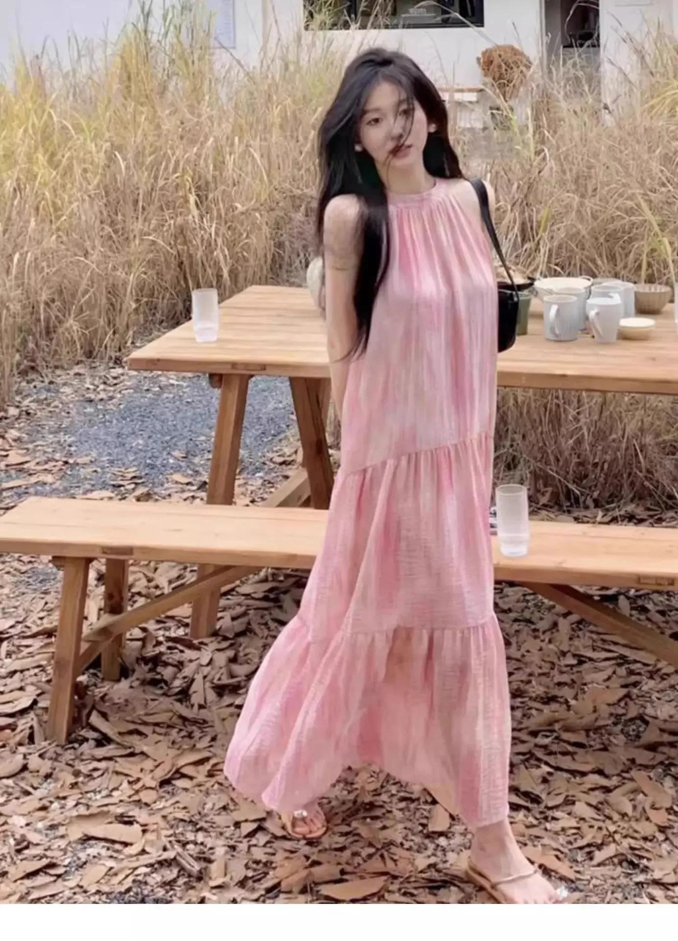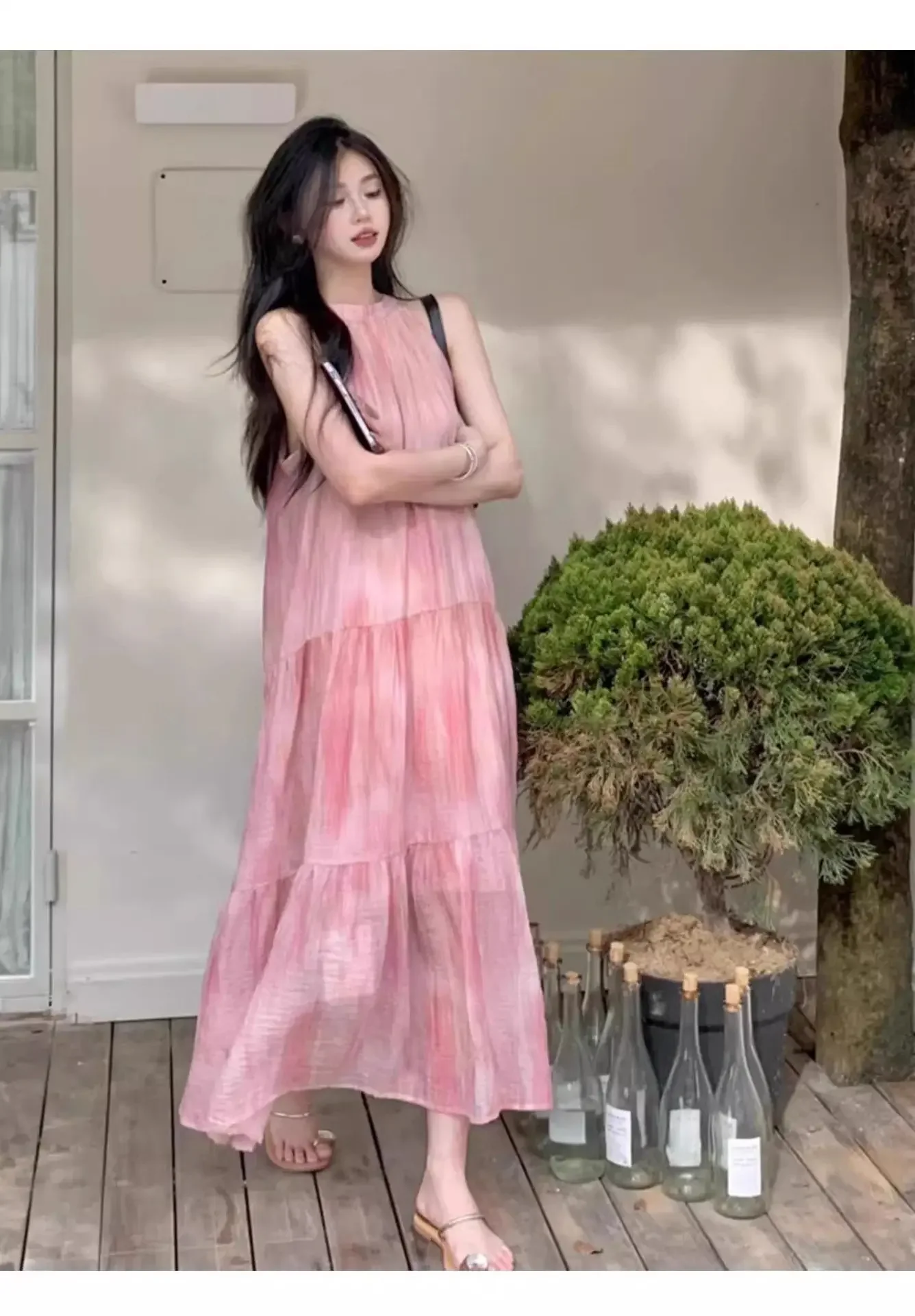 French Style Beautiful Halter Neck Midi Dress Summer Sleeveless Beach Tie Dye Skirt for Small Stature Women Pink Color