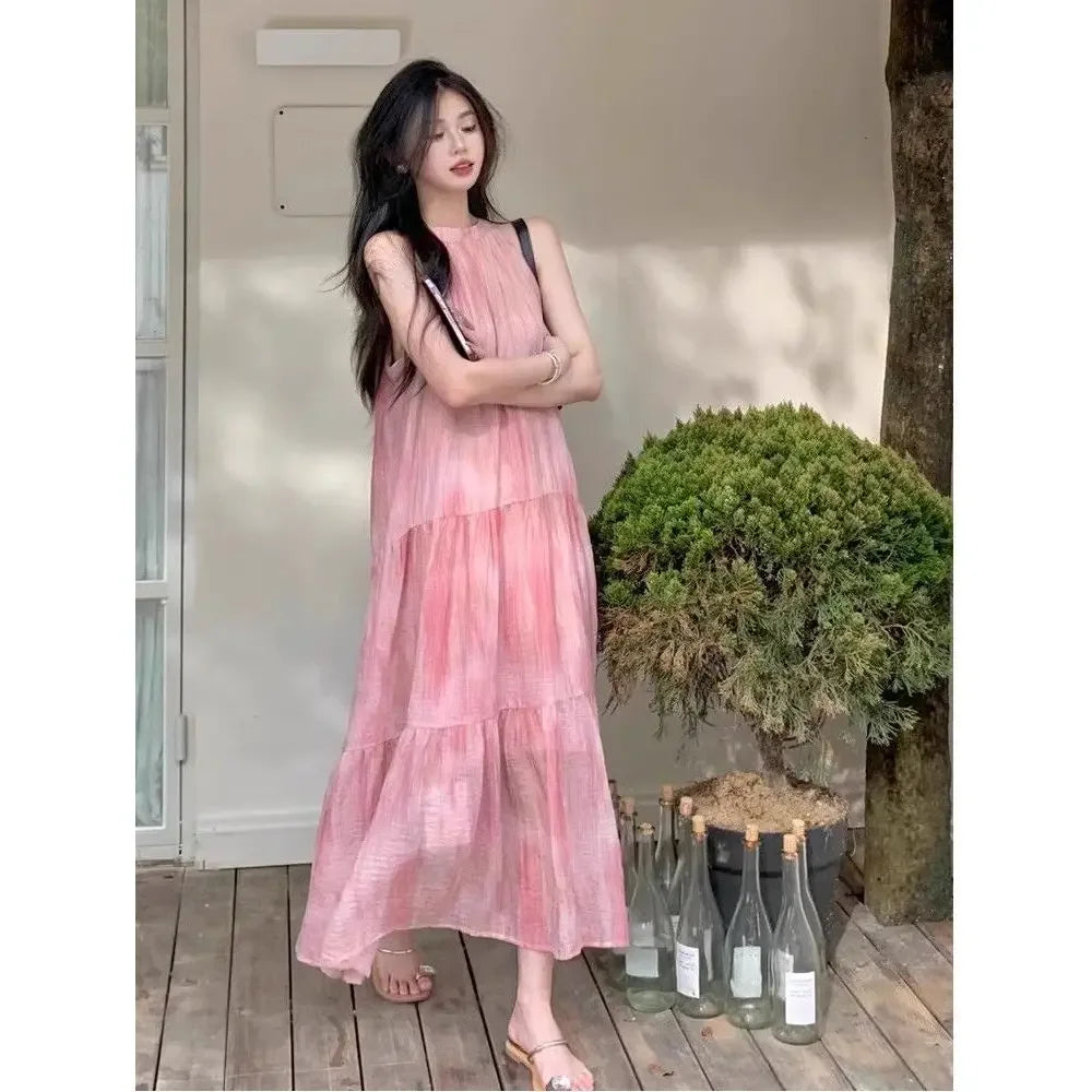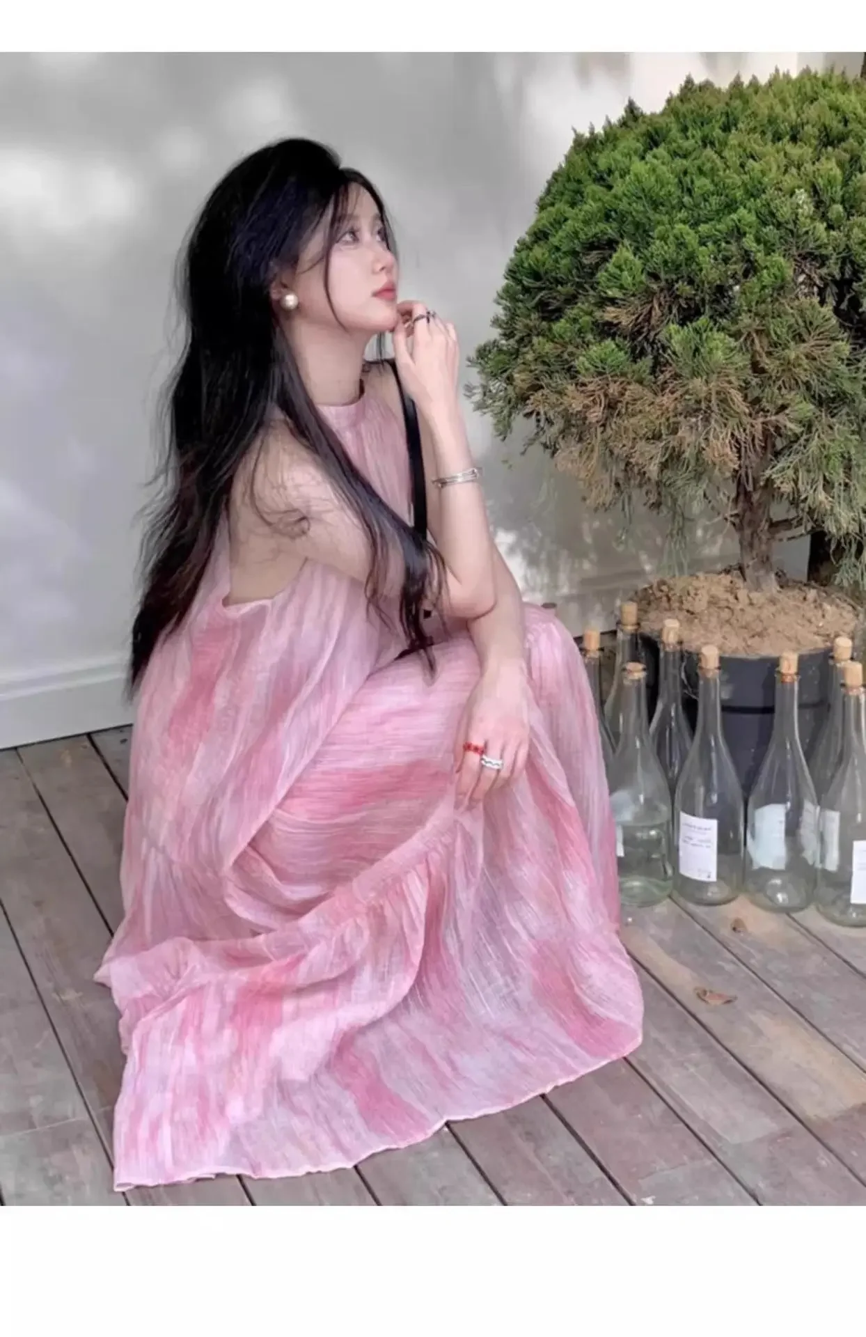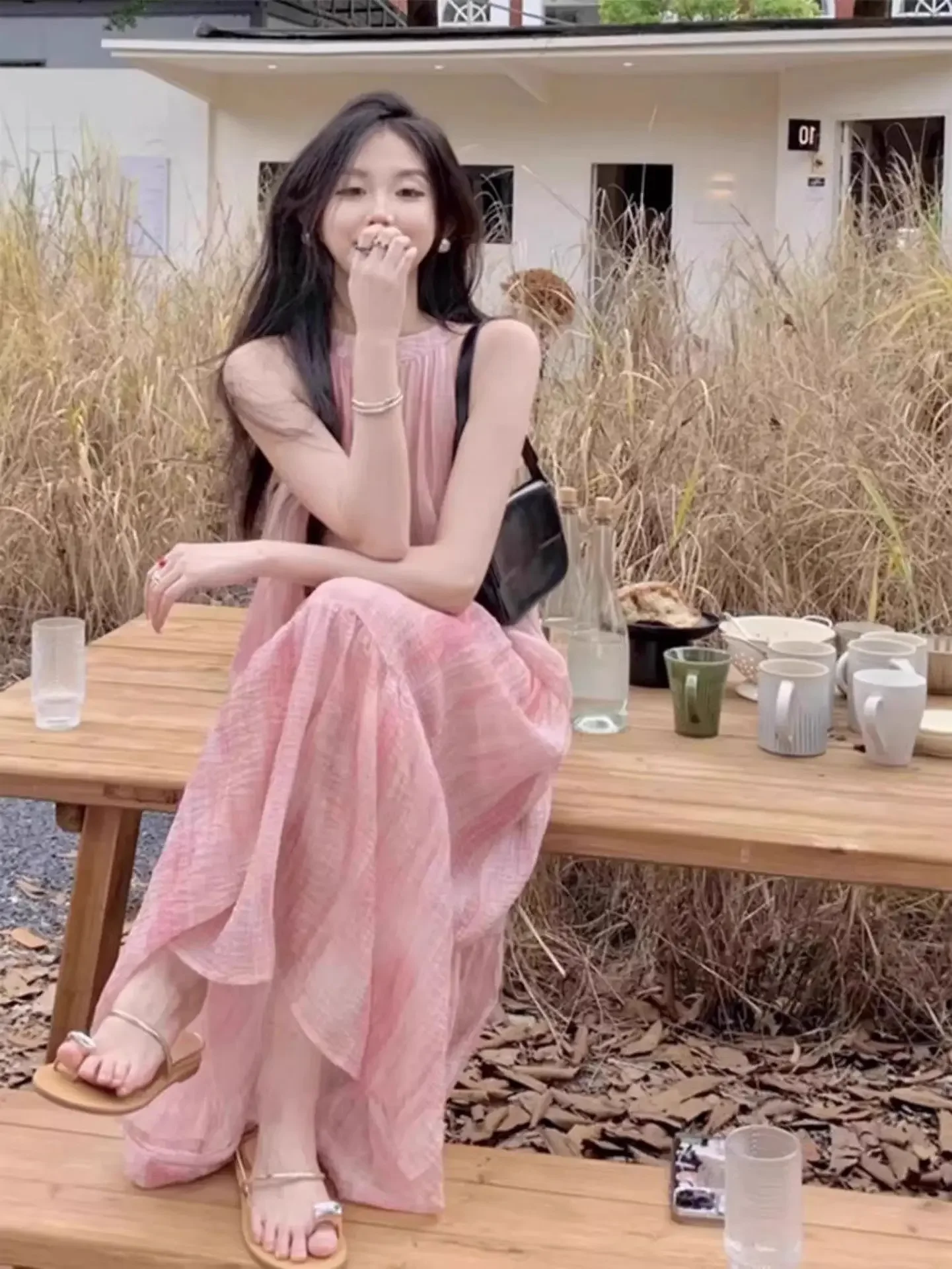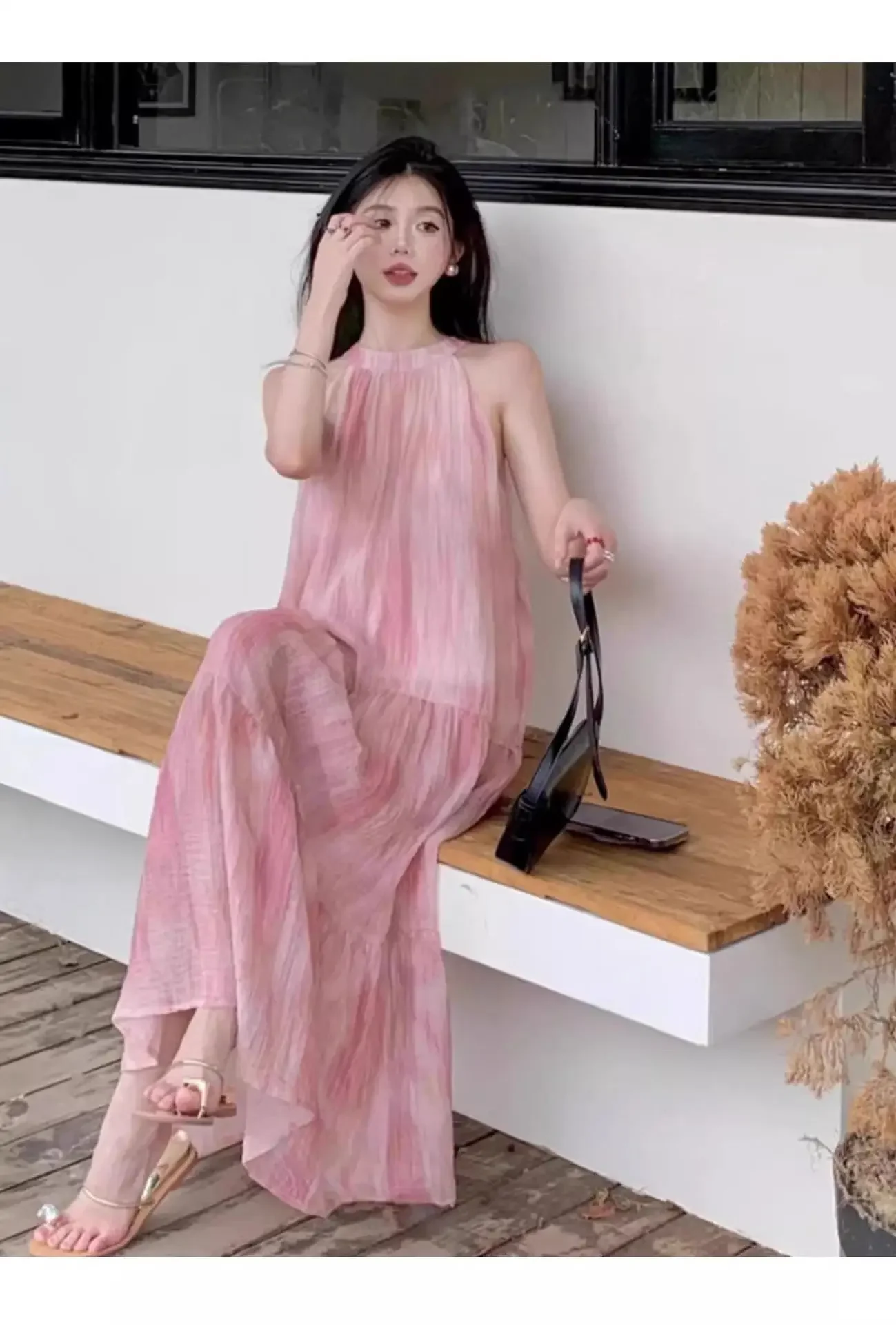 French Style Beautiful Halter Neck Midi Dress Summer Sleeveless Beach Tie Dye Skirt for Small Stature Women Pink Color