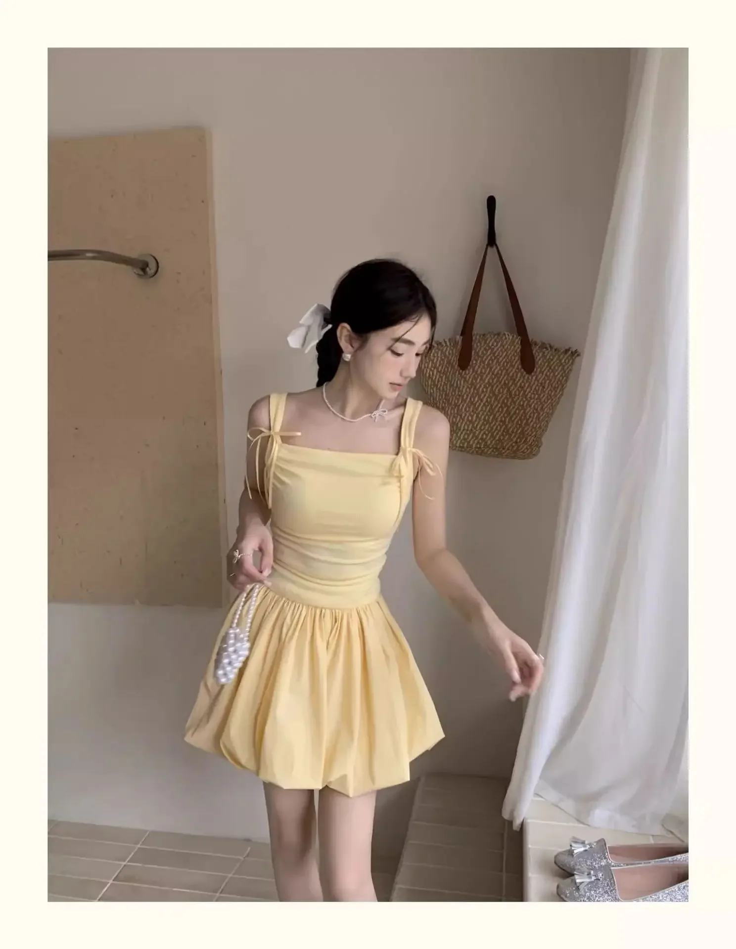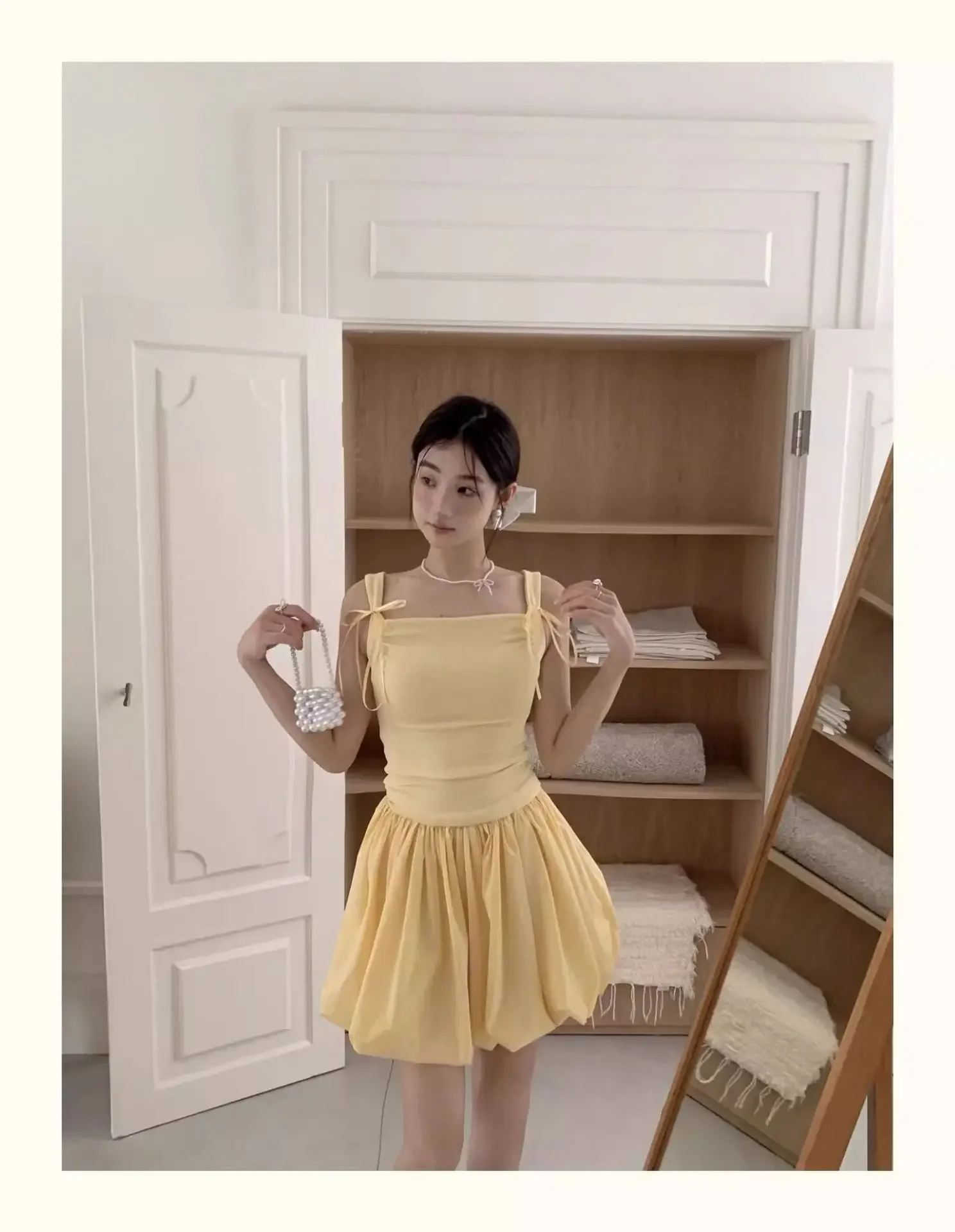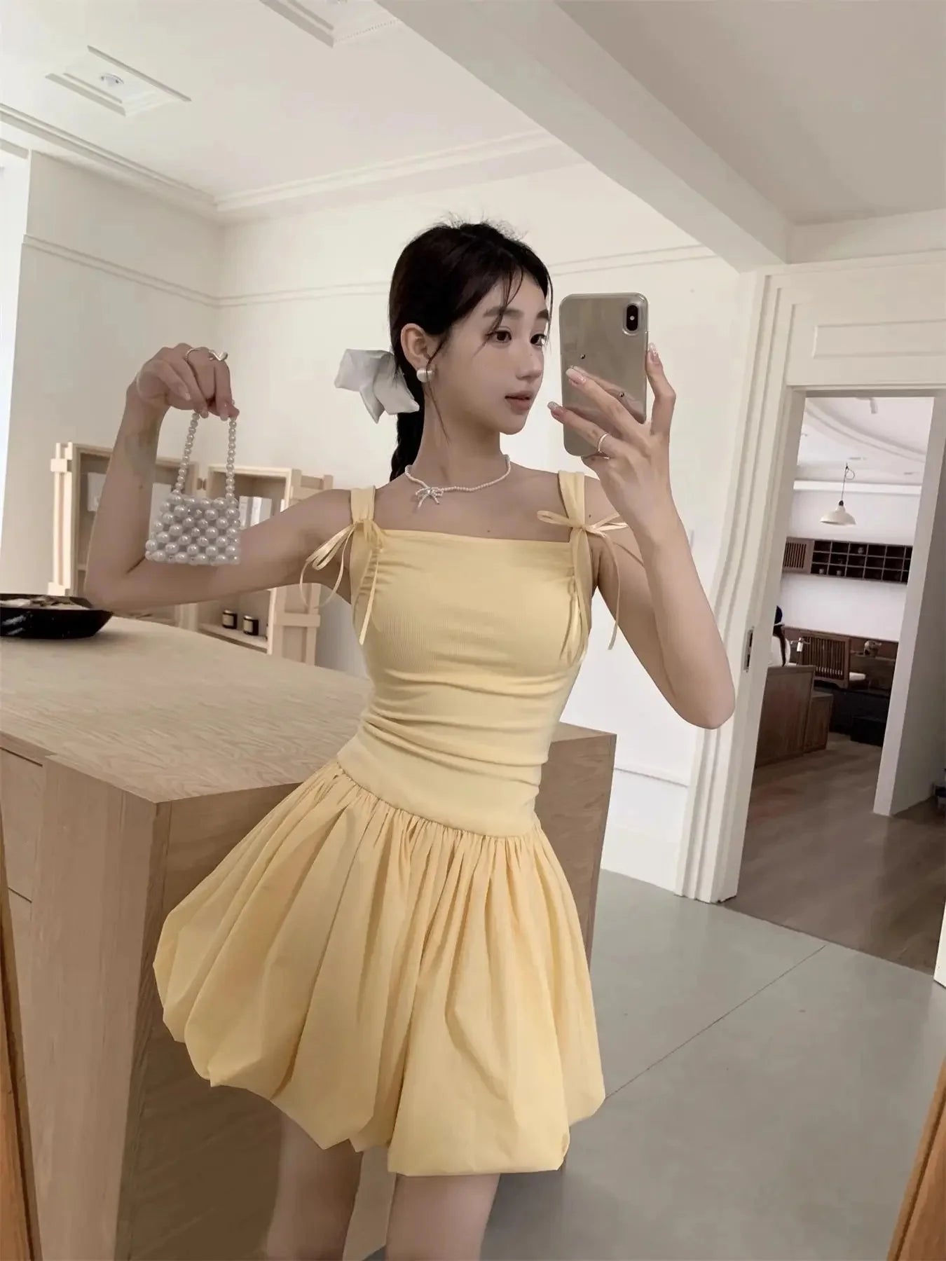 French Style Beautiful Milk Yellow Slim Fit Strap Dress Women's Unique Design Flower Bud Puffy Short Skirt Summer Dress