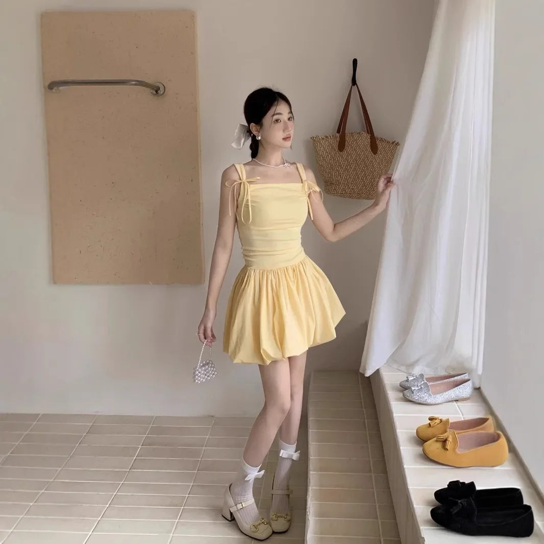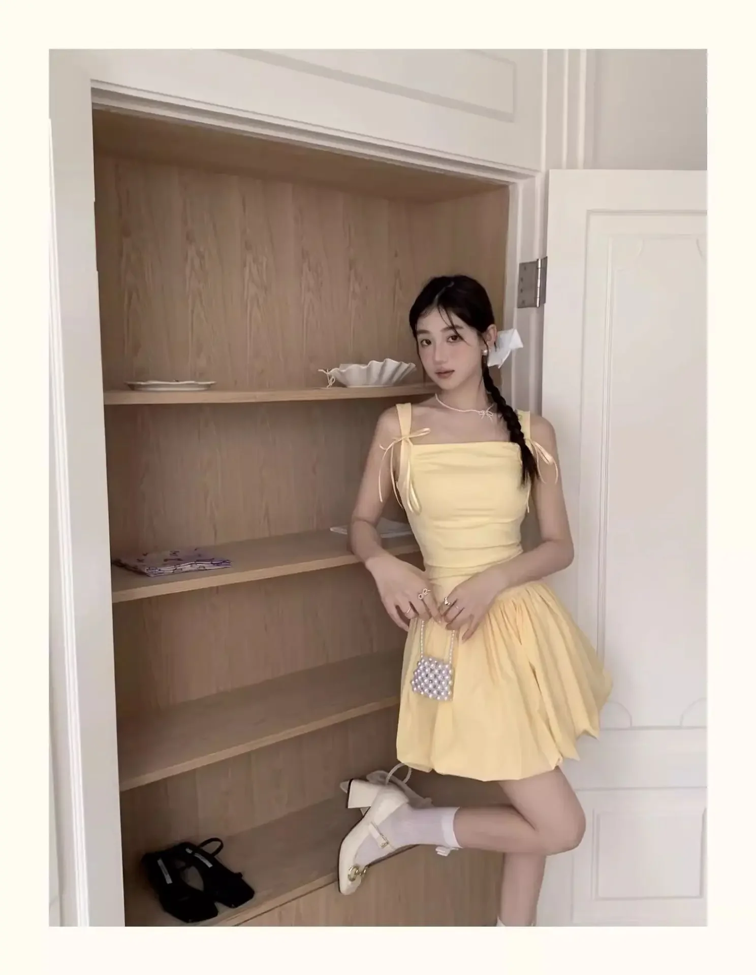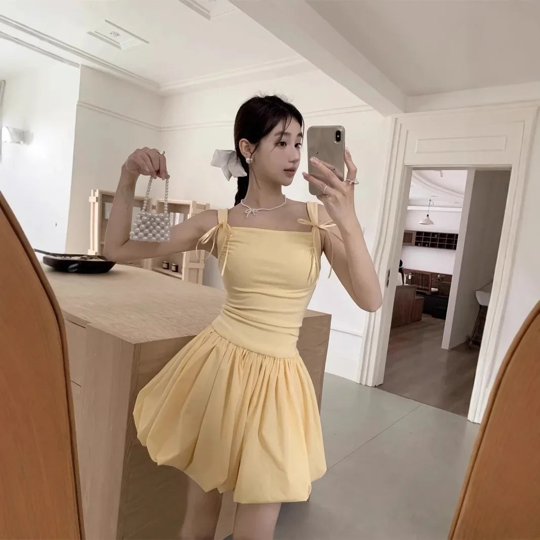 French Style Beautiful Milk Yellow Slim Fit Strap Dress Women's Unique Design Flower Bud Puffy Short Skirt Summer Dress