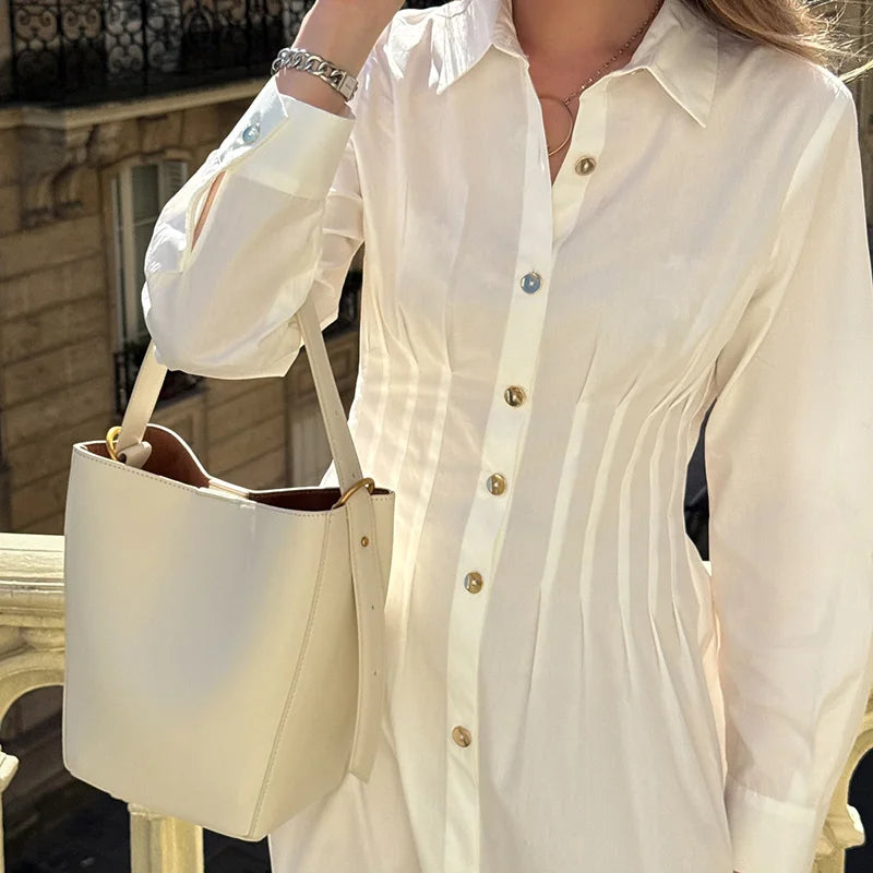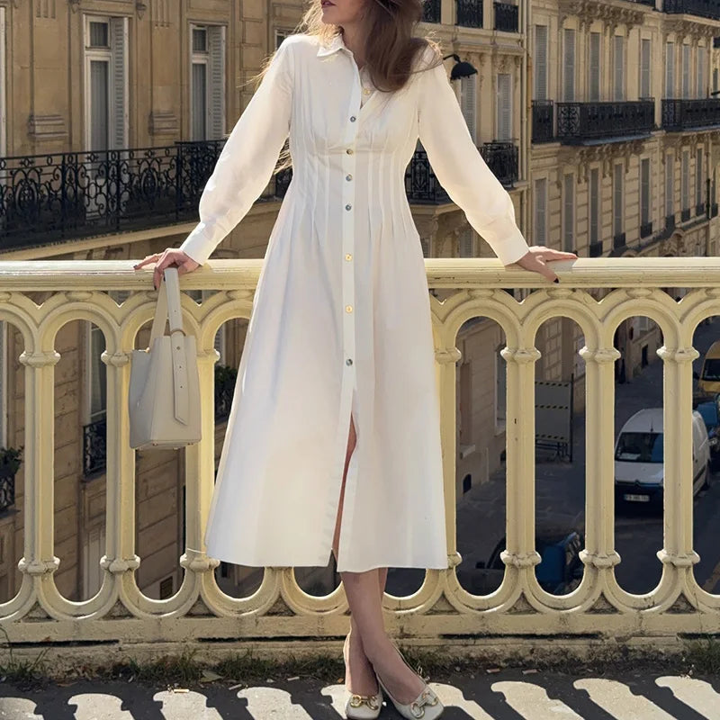 French Style Simple Long Sleeve Shirts Dress Elegant Lapel Single Breasted Slim Dress 2025 Autumn New Women's Commute Long Dress