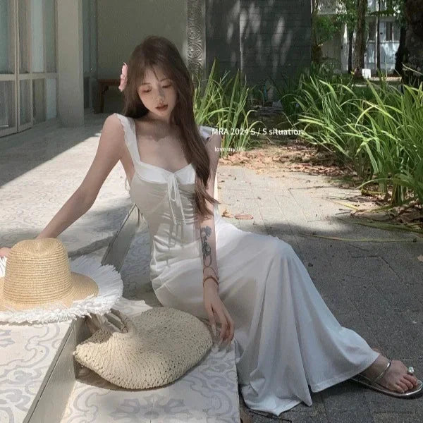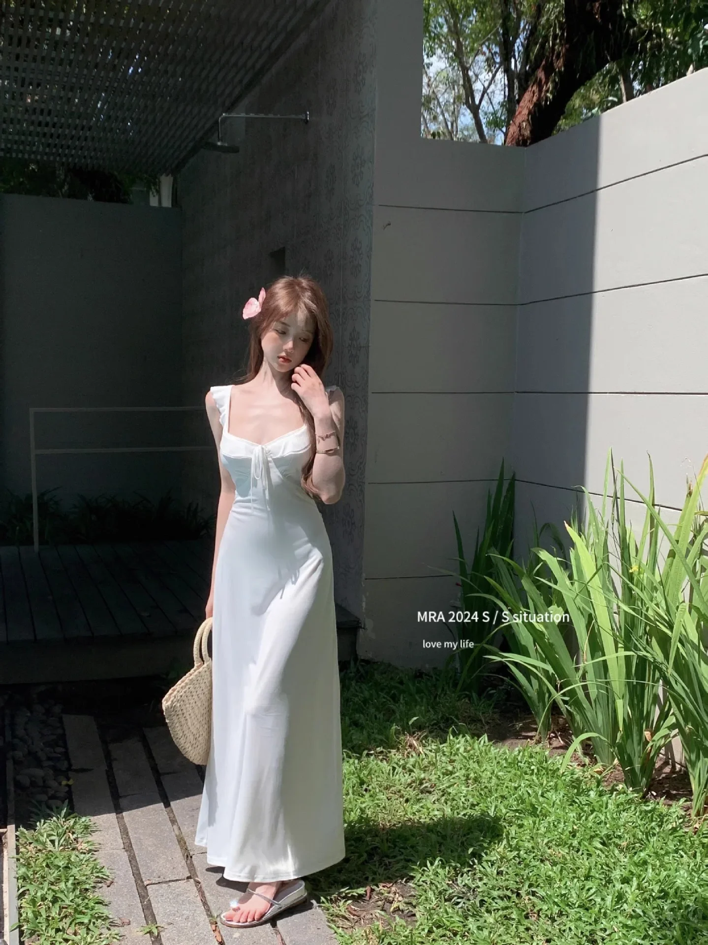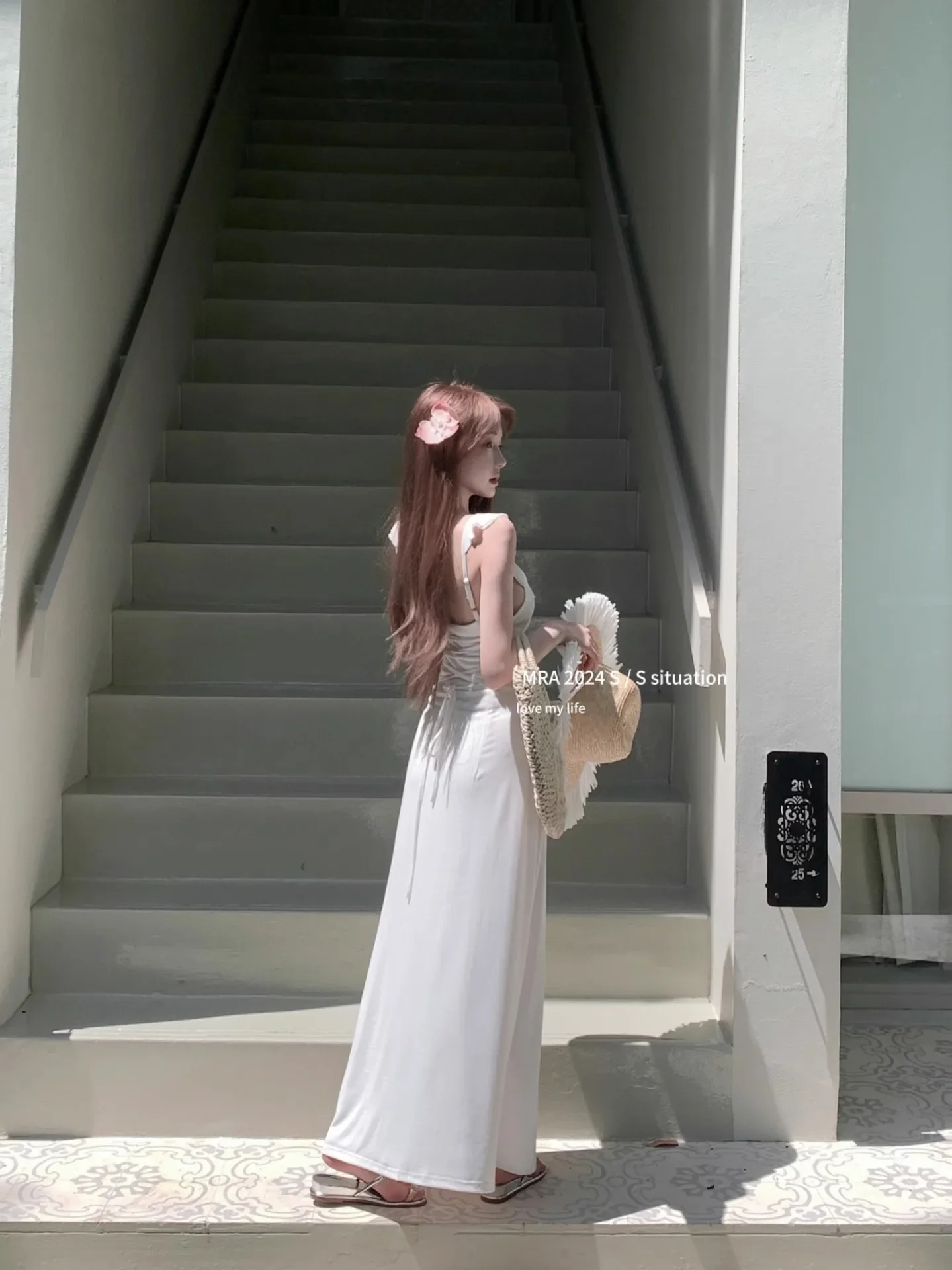 • Elegant Design : This white strap backless dress features a V-neck design and a beautiful long skirt, perfect for summer seaside holidays.
