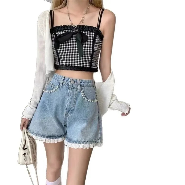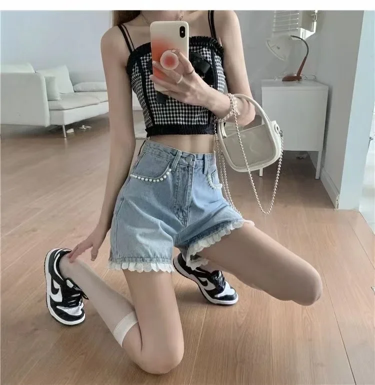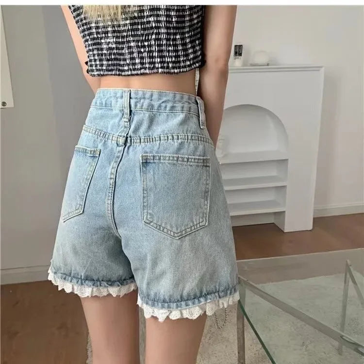 High Waist Lace Trimmed Denim Shorts Women Summer Thin Style Loose Wide Leg Pants Hot Pants Korean Style Cotton Shorts