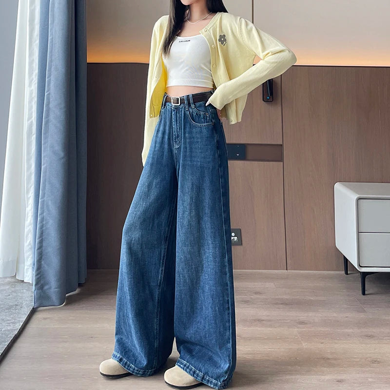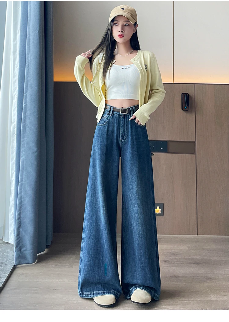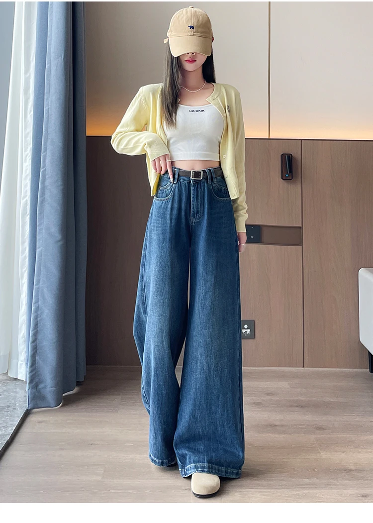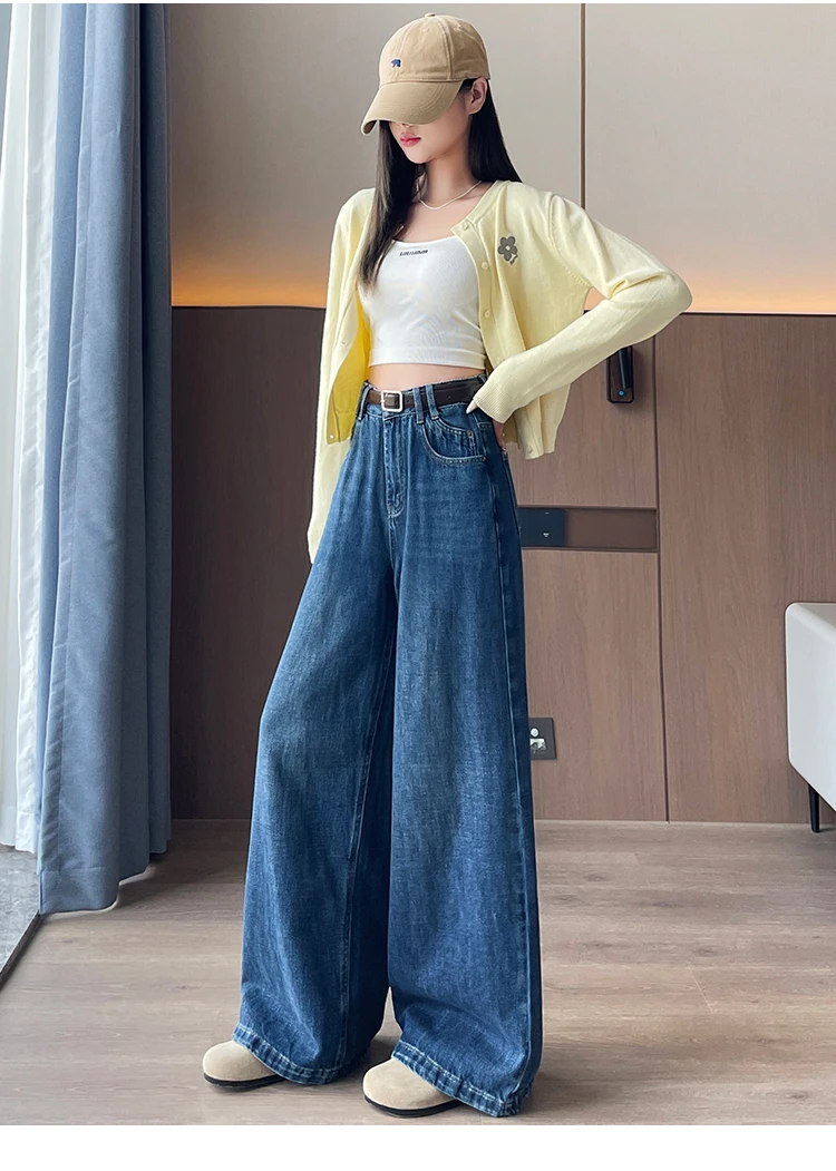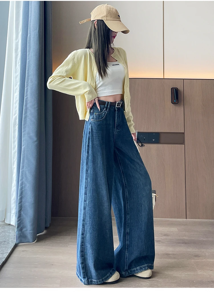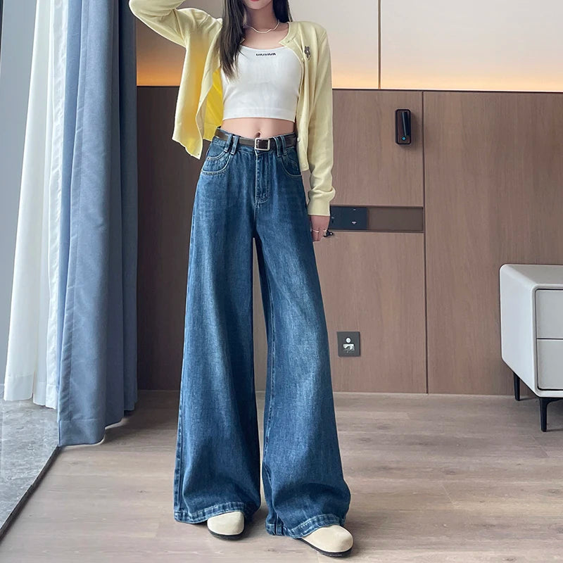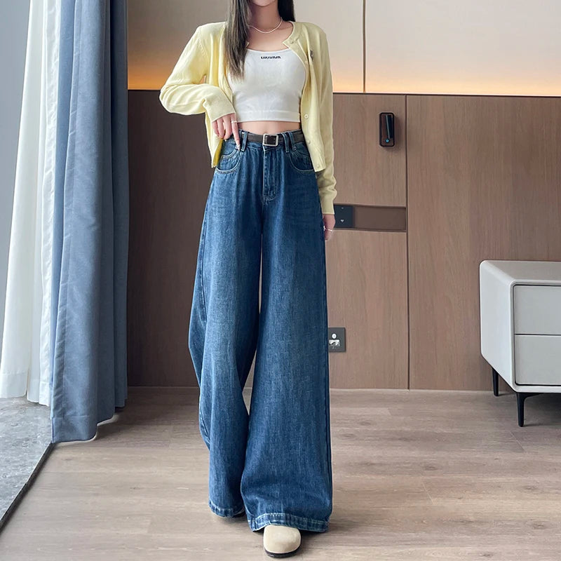 High-waisted Vintage Denim Wide-leg Pants. Ladies Spring Fall New Loose High Waist Double Buckle Floor-length Micro-flared Jeans