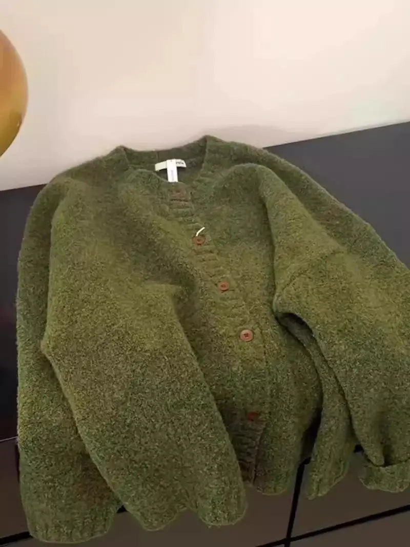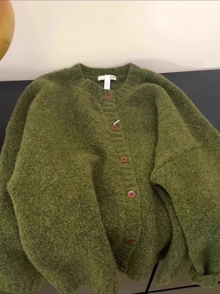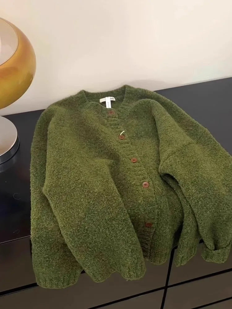 Retro Green Knitted Cardigan Women's New Autumn/Winter Round Neck Single Breasted Soft Thick Sweater Loose Casual Commuting Coat