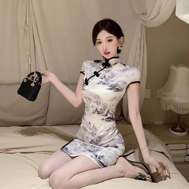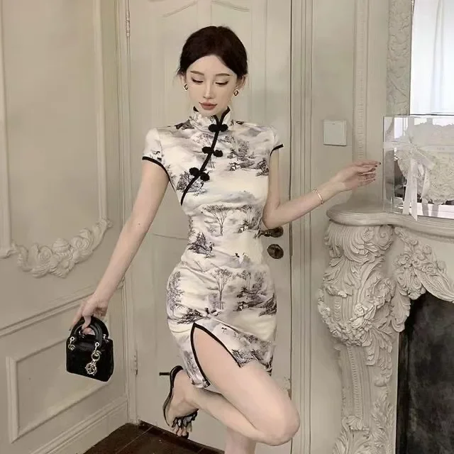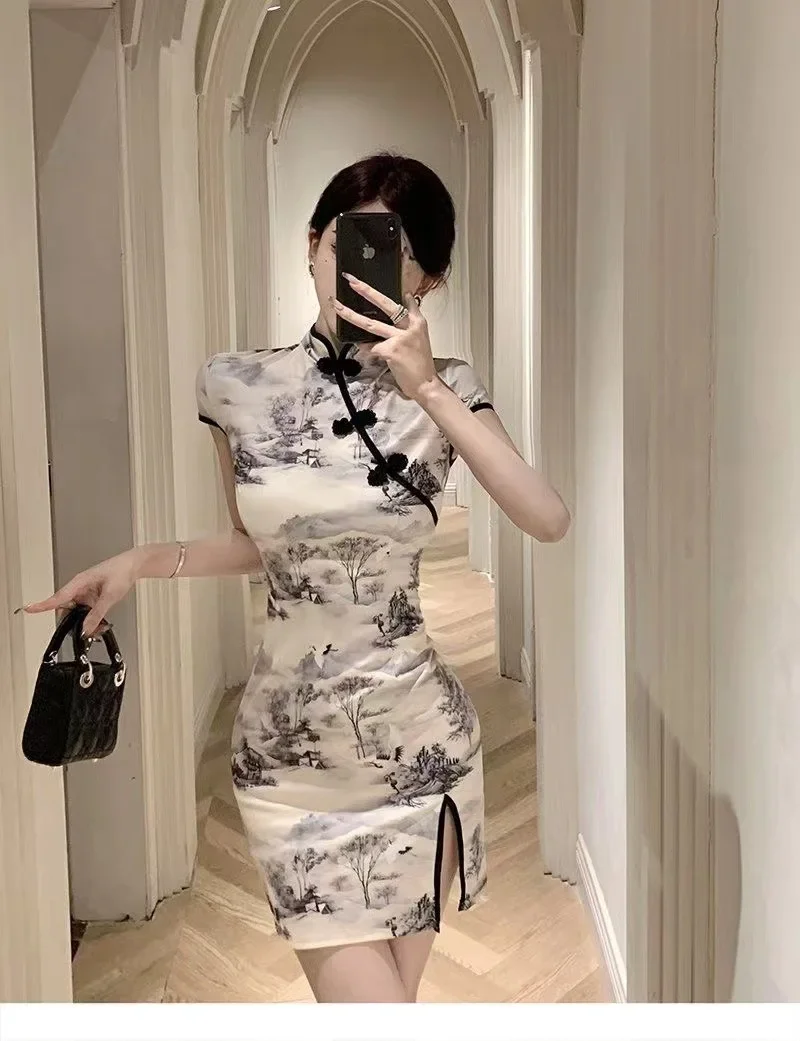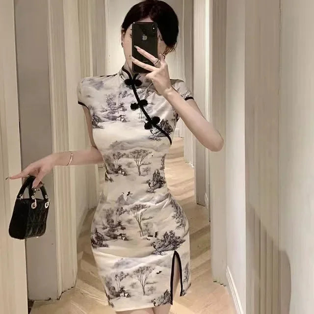 Slimming Chinese Style Princess Sleeve Polo Collar Midi Dress Waist Cinched Open Side Slit Daily Qipao Summer Dress