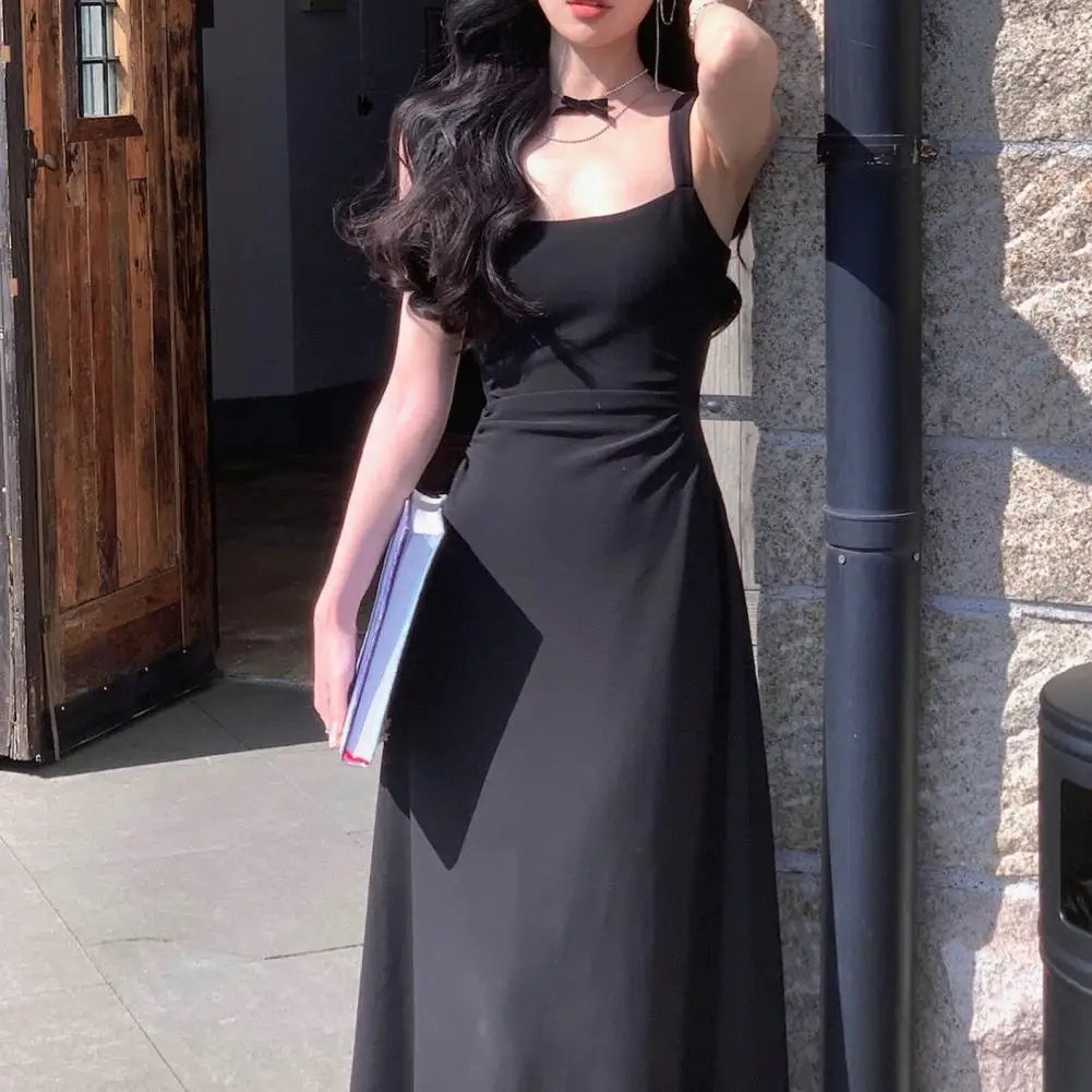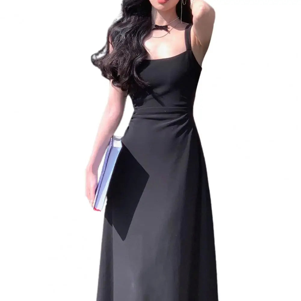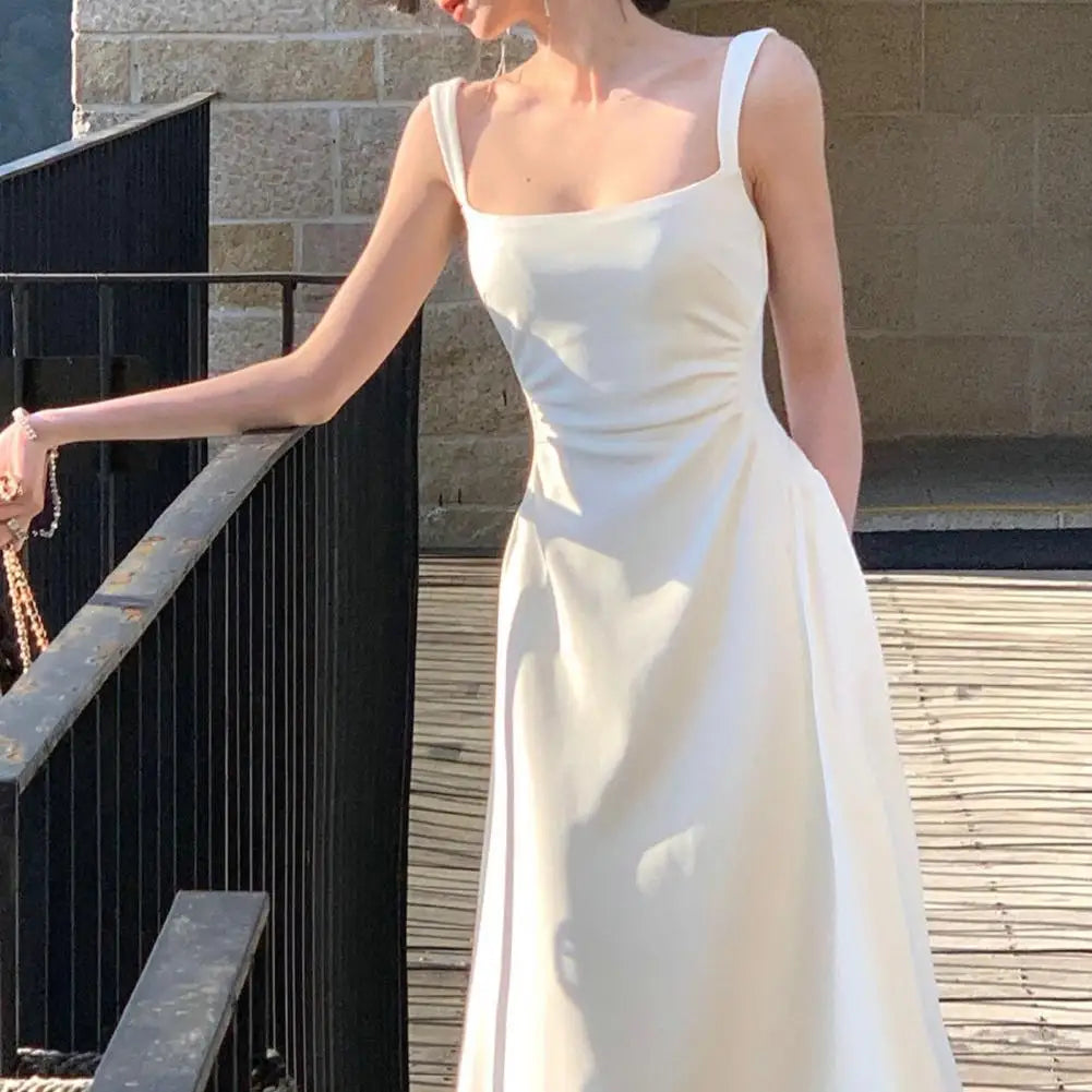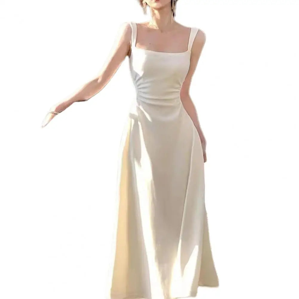 Evening Party Women Dress Low-cut Square Neck Sleeveless High Tight Waist A-line Pleated Solid Color Frence Style Ankle Length Prom Banquet Maxi Dress