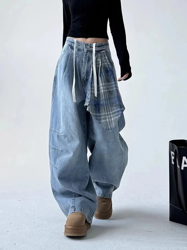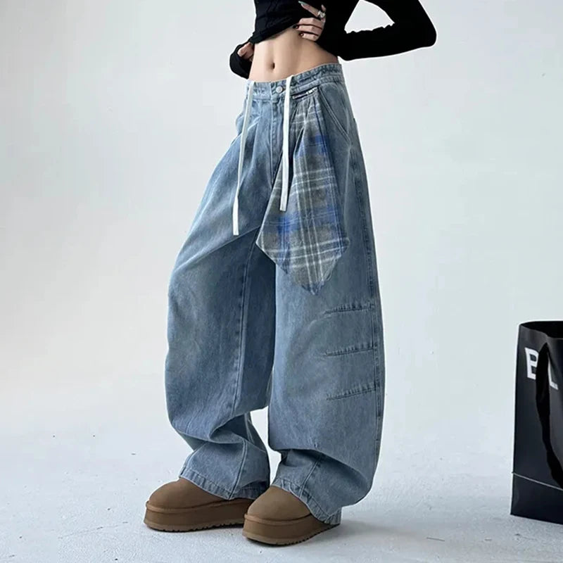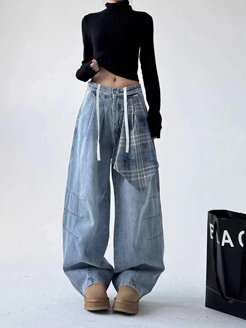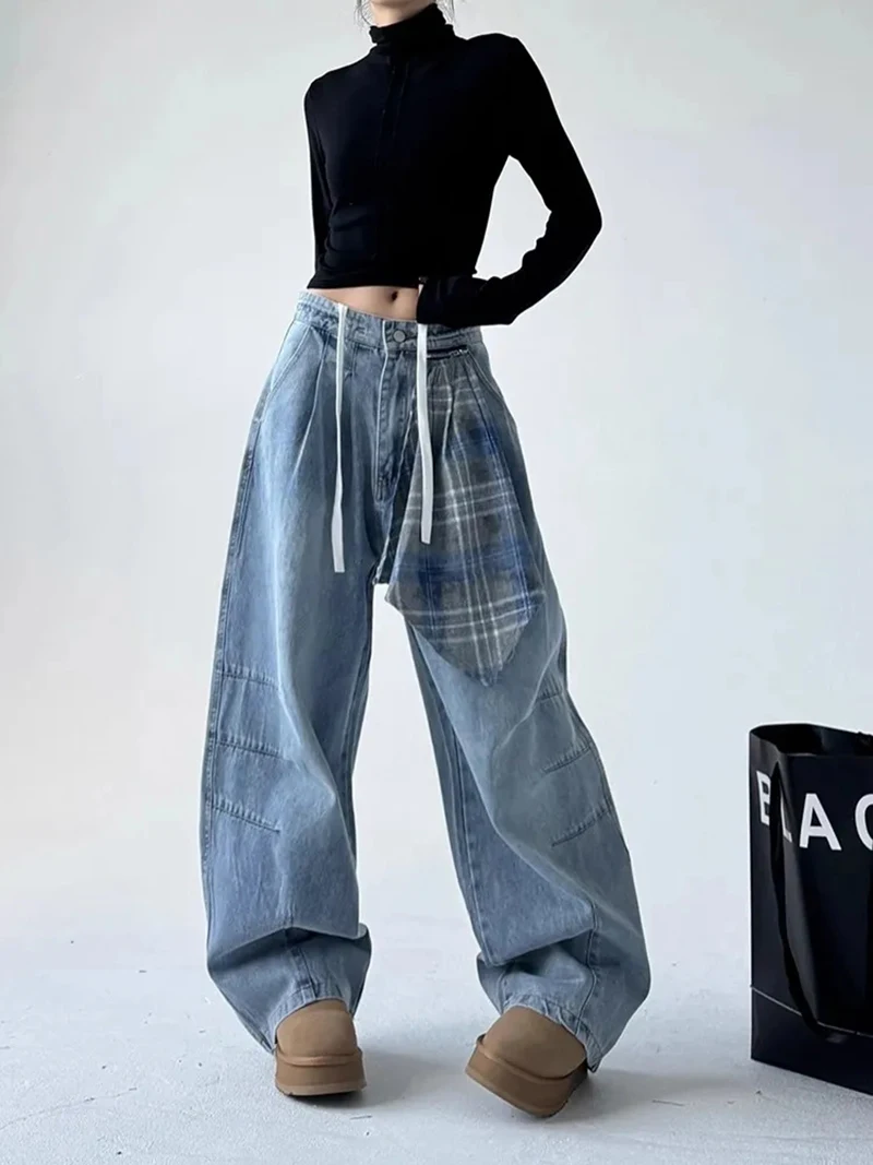 Vintage Streetwear Women Jeans Plaid Square Scarf Patchwork Wide Leg Denim Pants Loose Street Dance Lace Up High Waist Trouser
