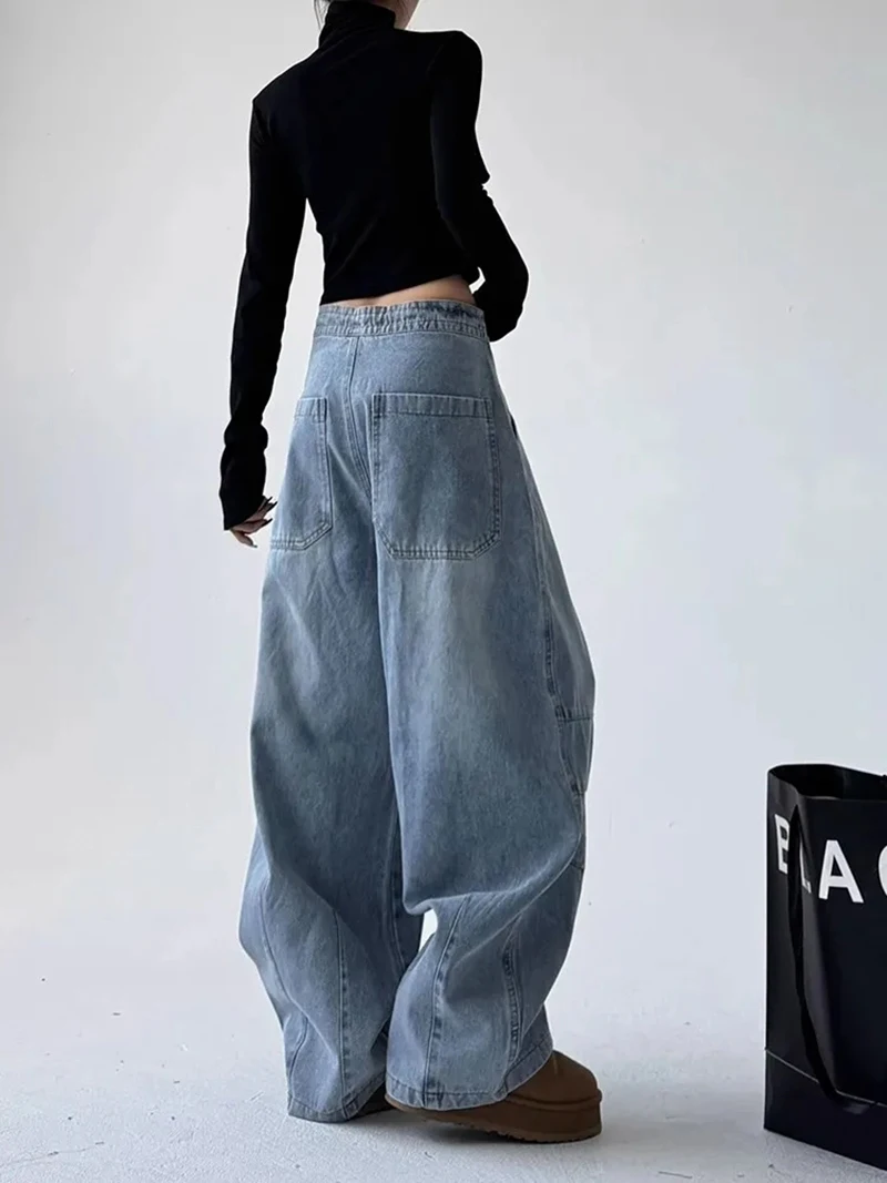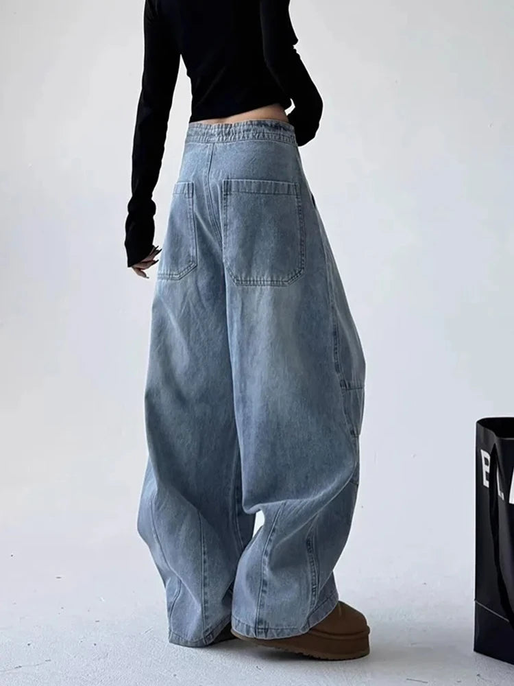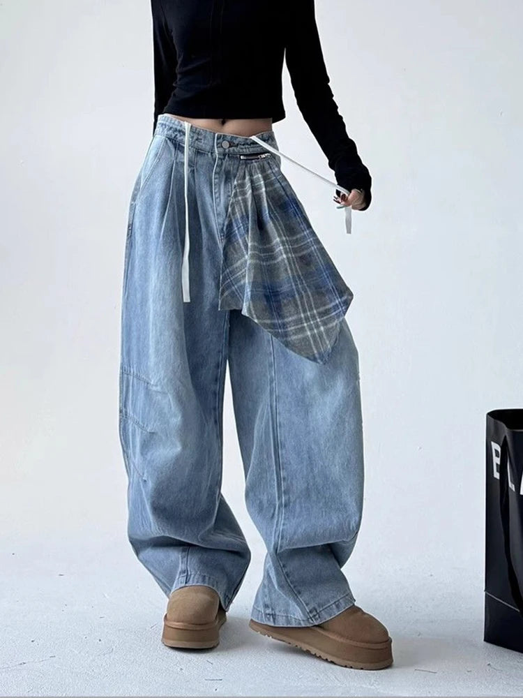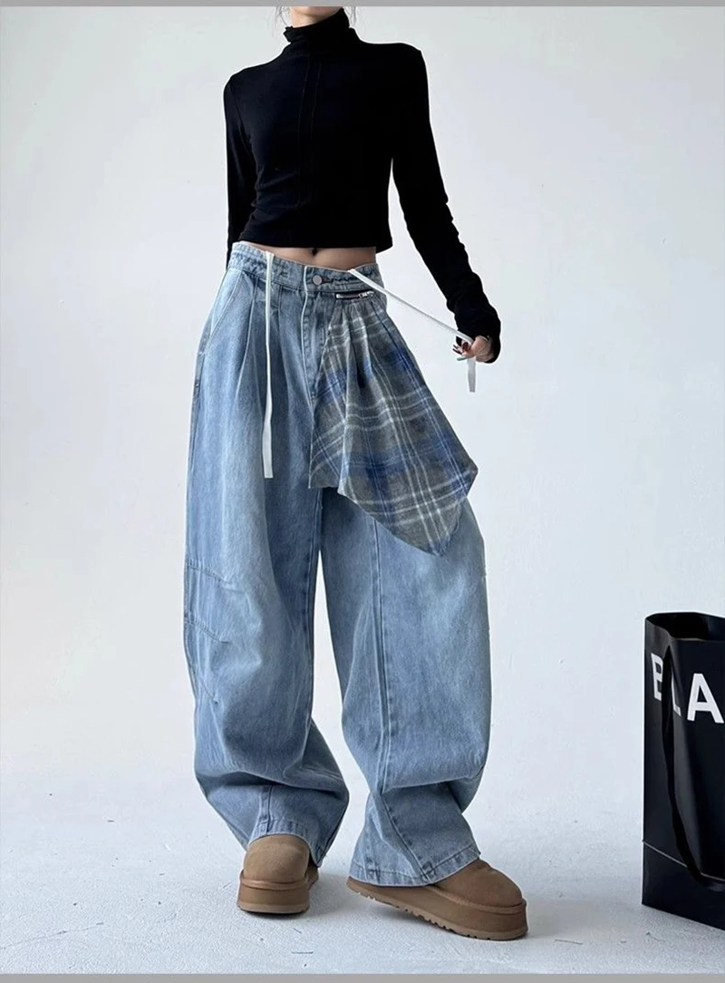 Vintage Streetwear Women Jeans Plaid Square Scarf Patchwork Wide Leg Denim Pants Loose Street Dance Lace Up High Waist Trouser