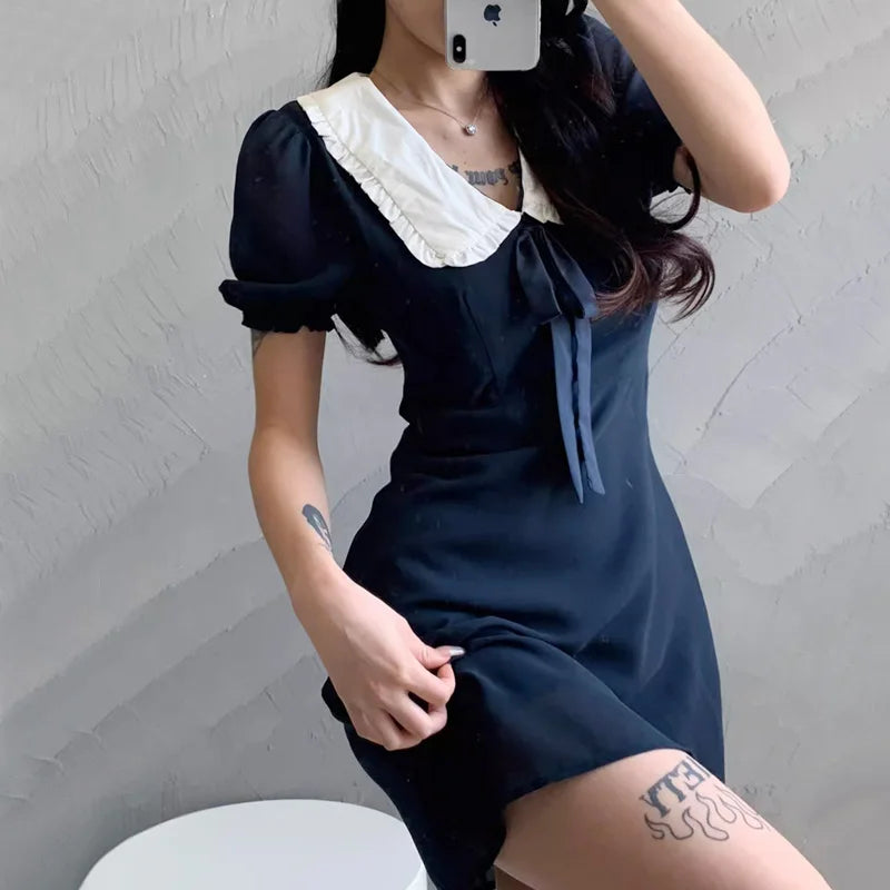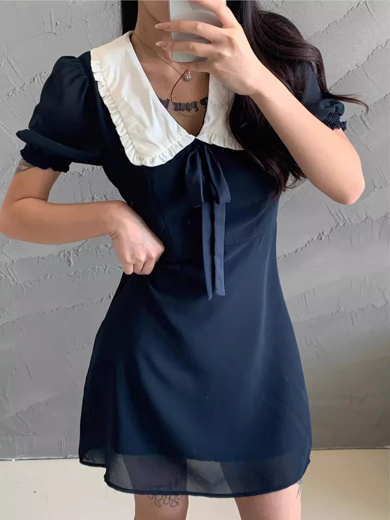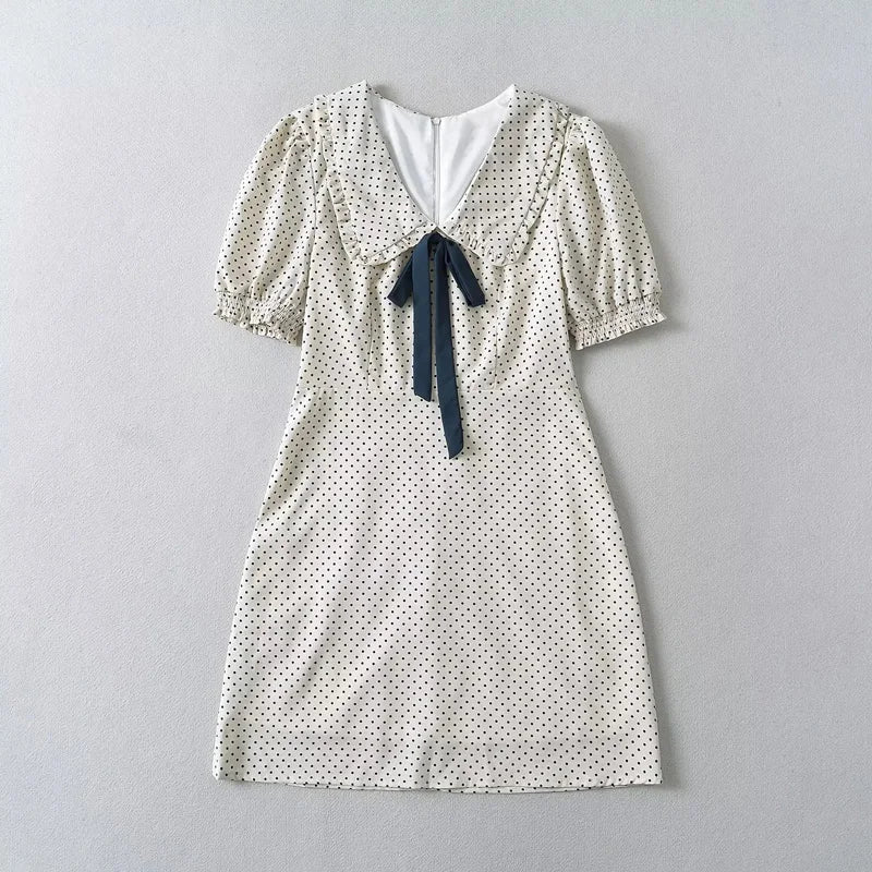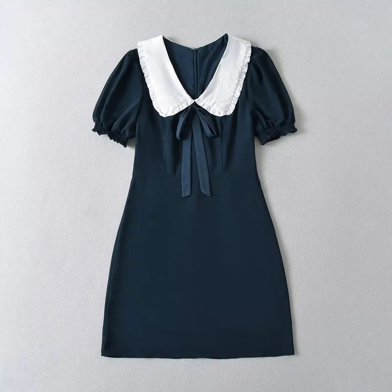 Women Oversized Collar Puff Sleeve Mini Dress With Bow Detail