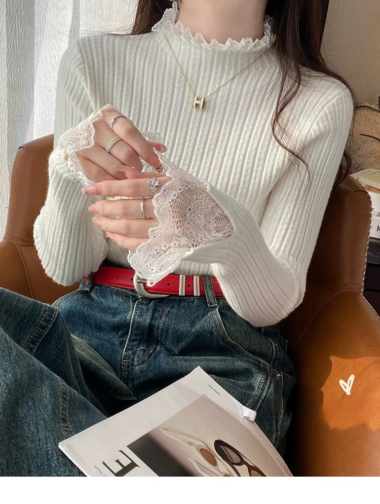 Women Solid Color Tops Autumn Winter Turtleneck Skinny Elastic Knitted Pullovers Female Long Sleeve Knit Patctwork Lace Sweater