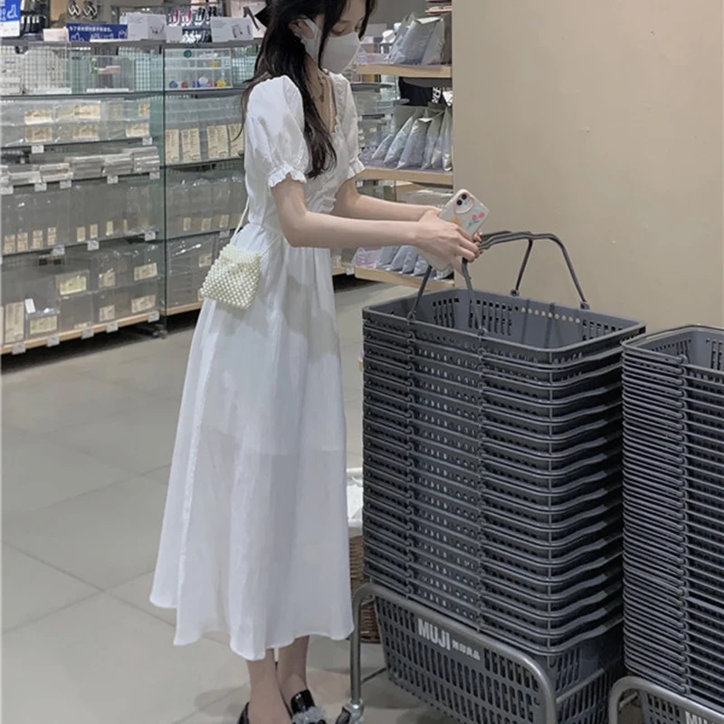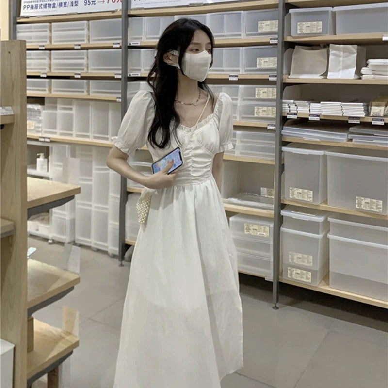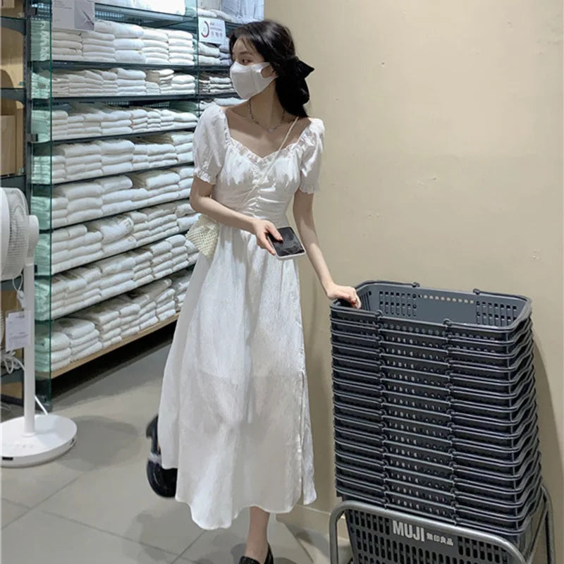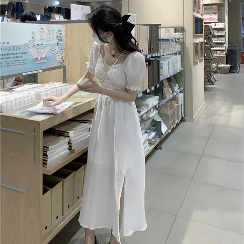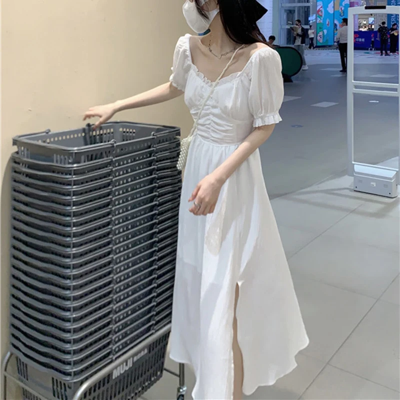 Women Vogue White Side Slit Chiffon Dress Lady Sweet Ruched Prom Cinderella Dress Female Elastic Puff Short Sleeve Midi Dress